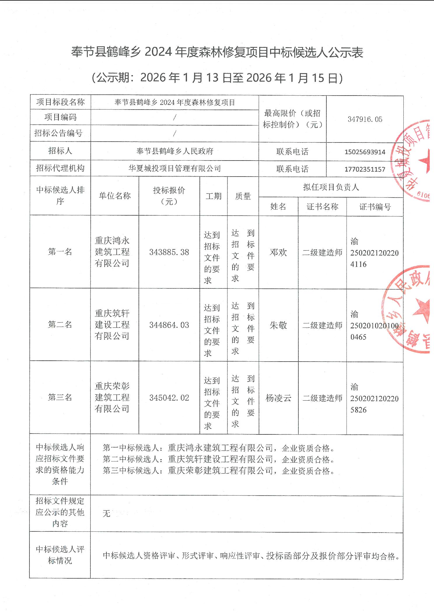 奉节县鹤峰乡2024年度森林修复项目中标候选人公示表