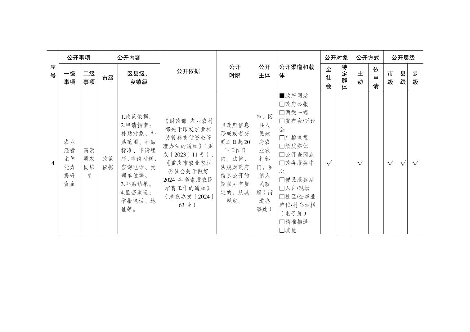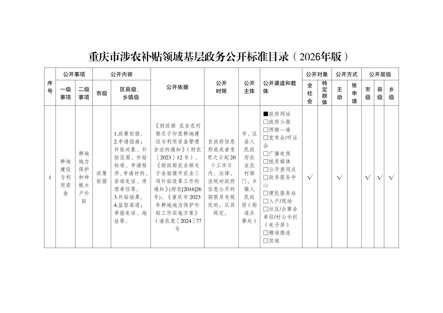 重庆市涉农补贴领域基层政务公开标准目录(2026版)