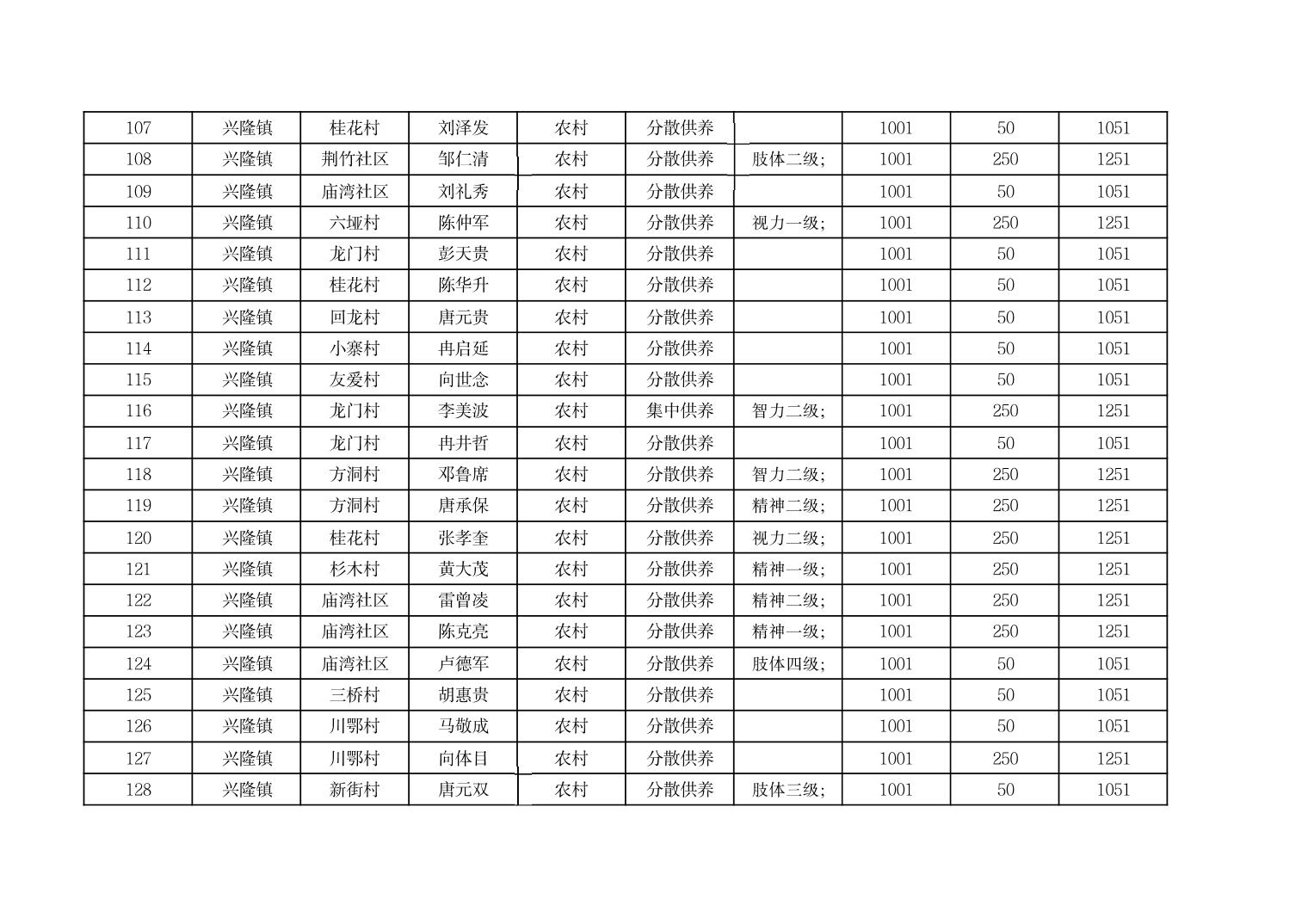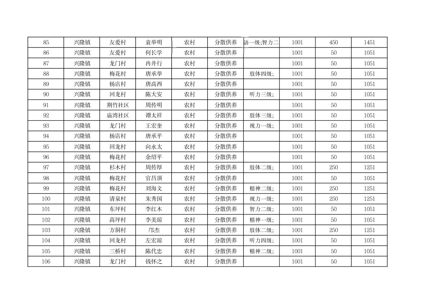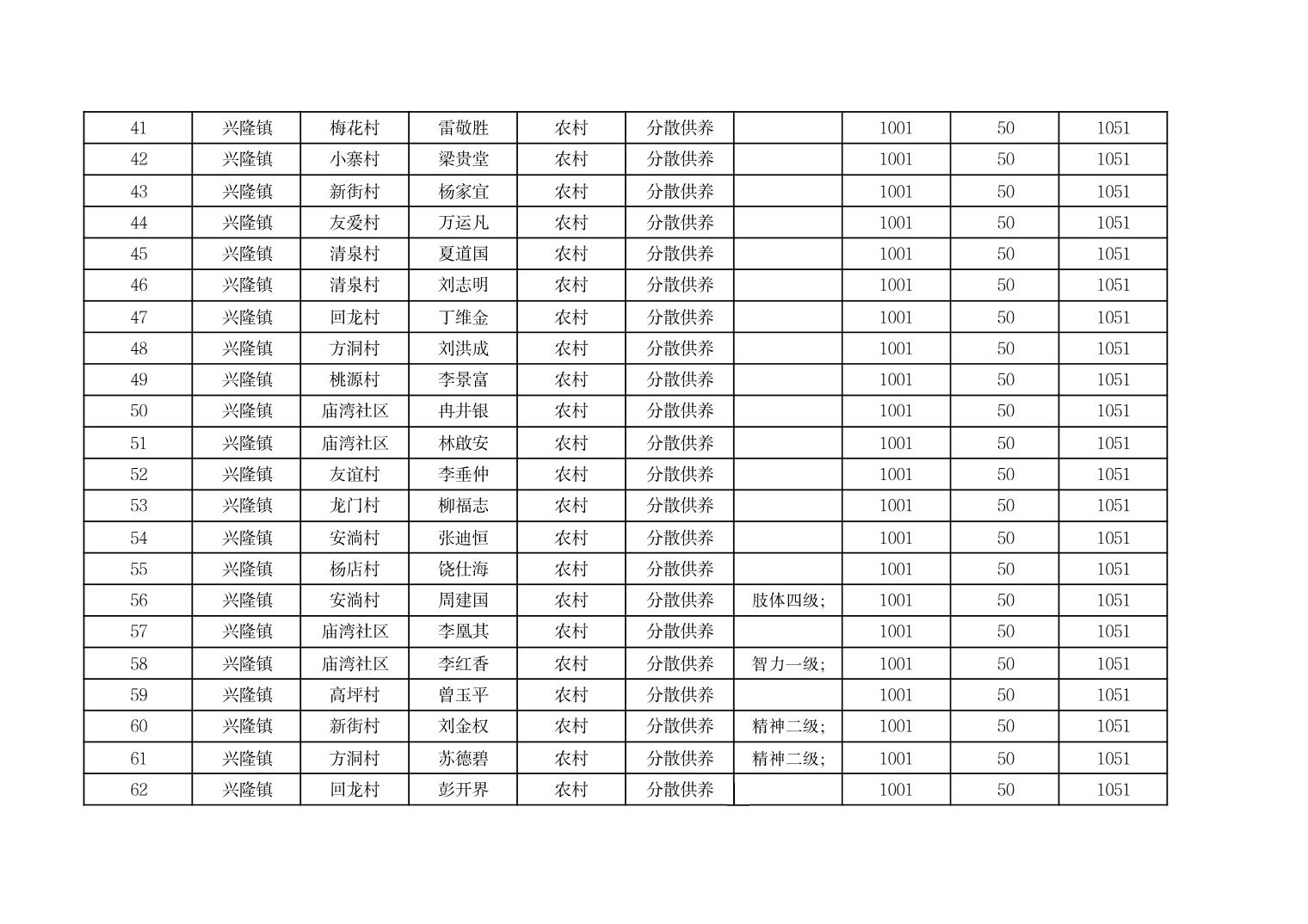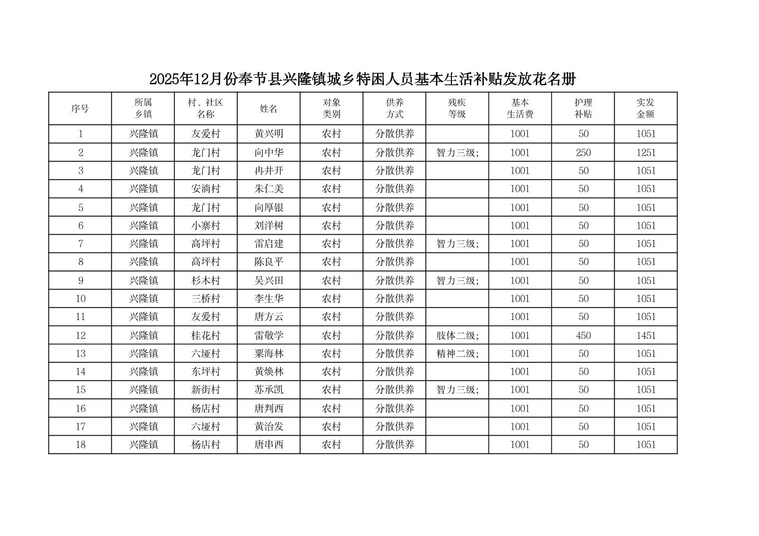 2025年12月份奉节县兴隆镇城乡特困人员基本生活补贴发放花名册