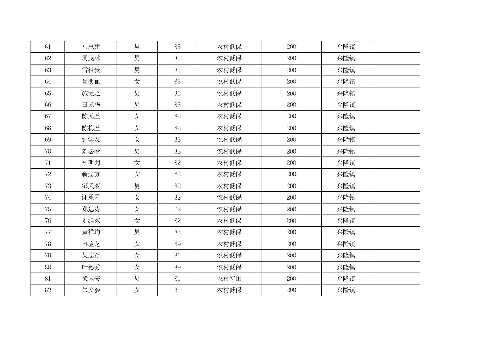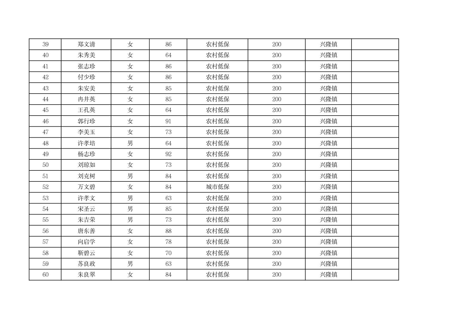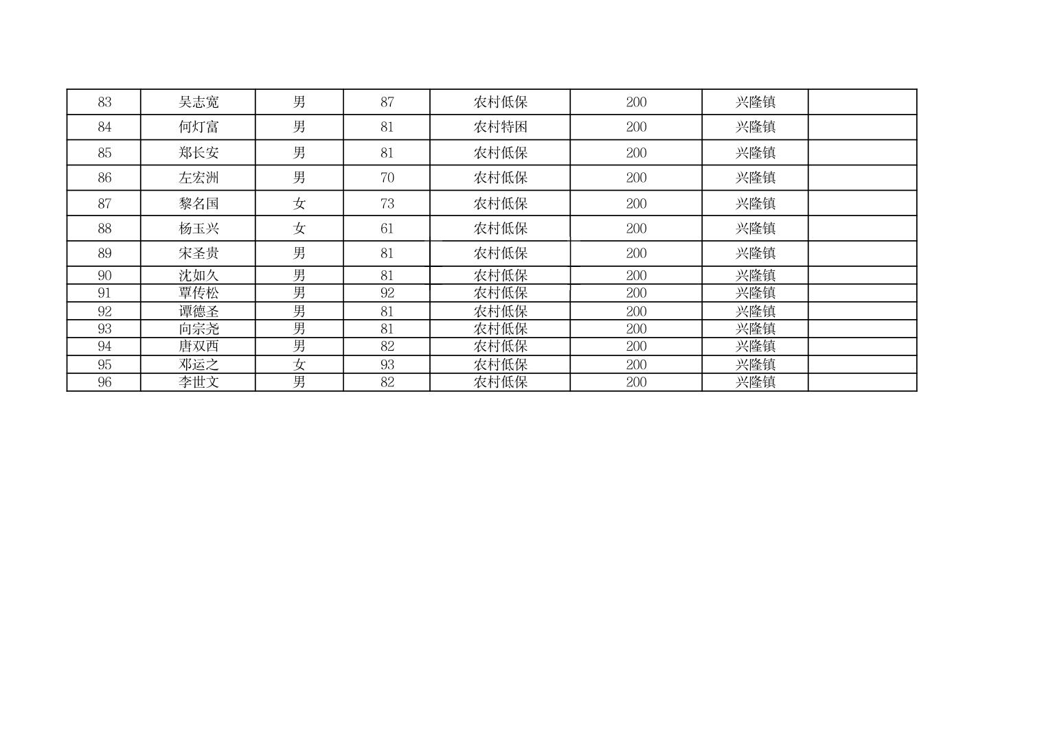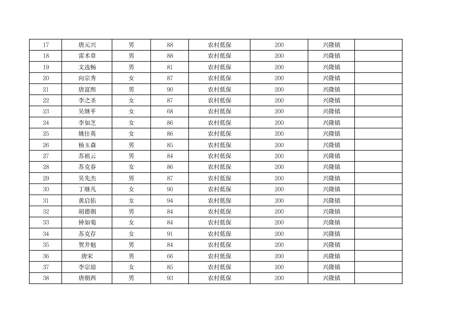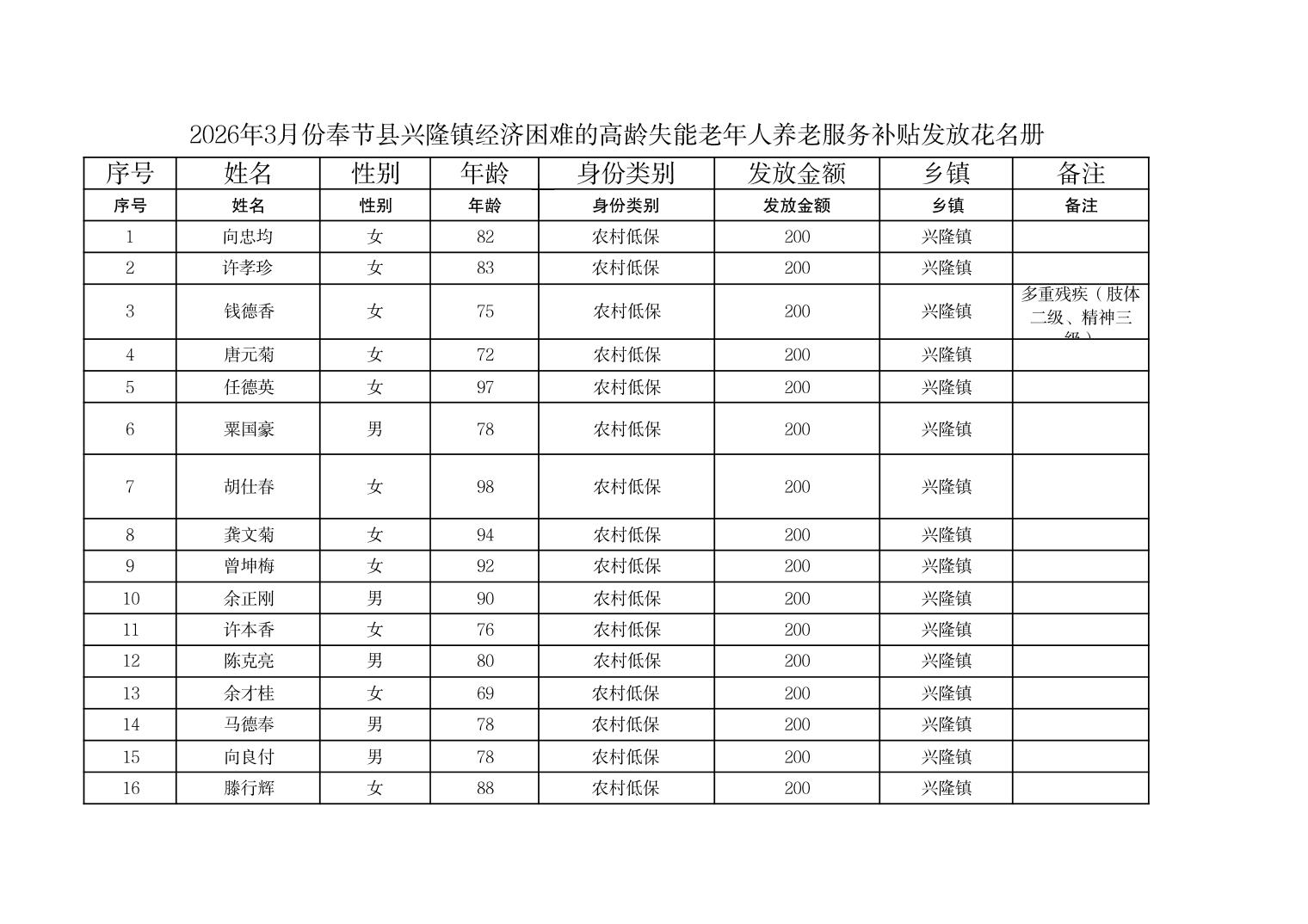 2026年3月份奉节县兴隆镇经济困难的高龄失能老年人养老服务补贴发放花名册