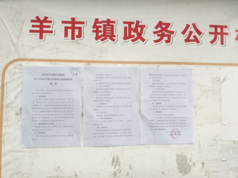 奉节县羊市镇人民政府关于2026年度公开招用公益性岗位的公示公告