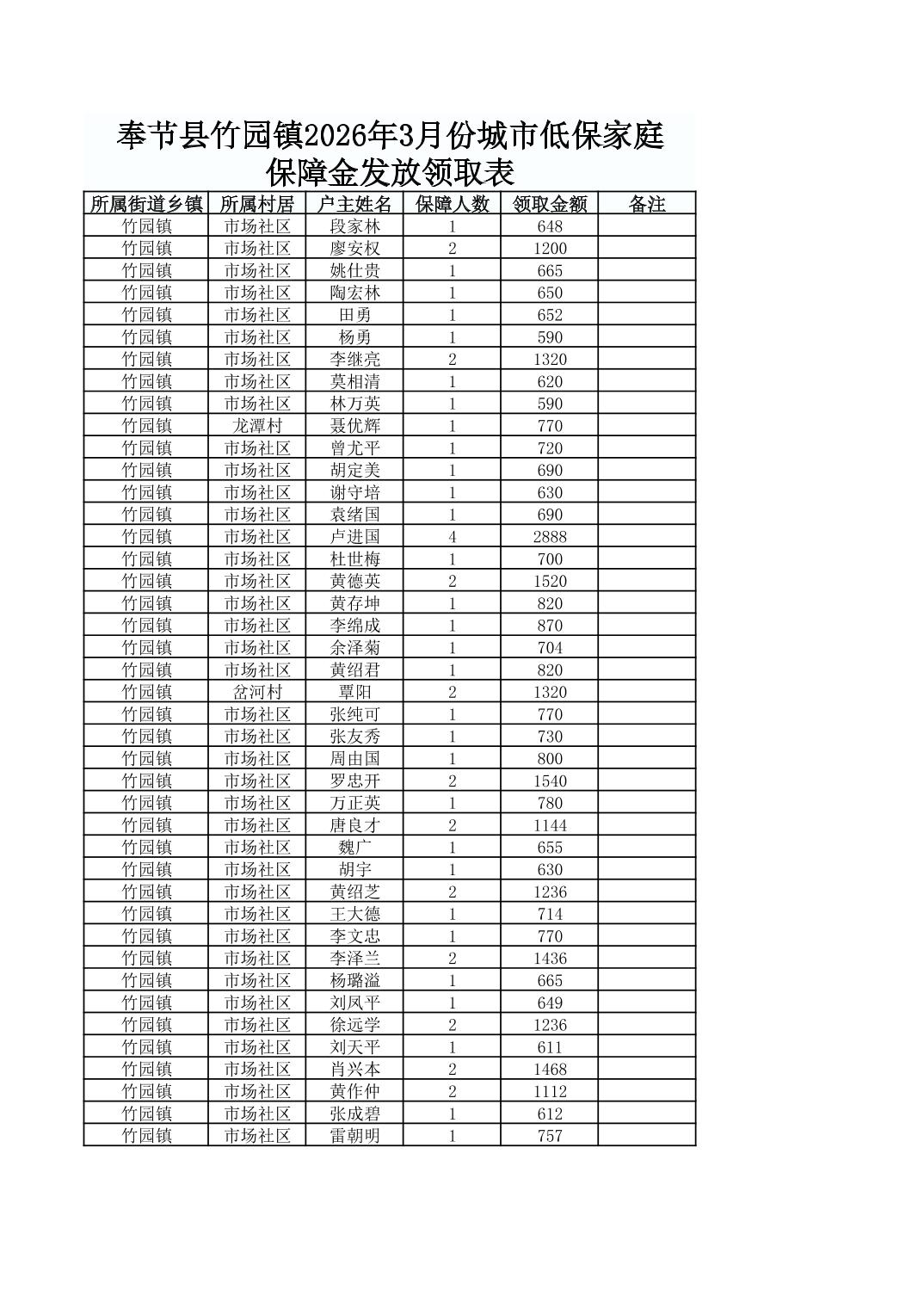 奉节县竹园镇2026年3月份城市低保家庭保障金发放领取表