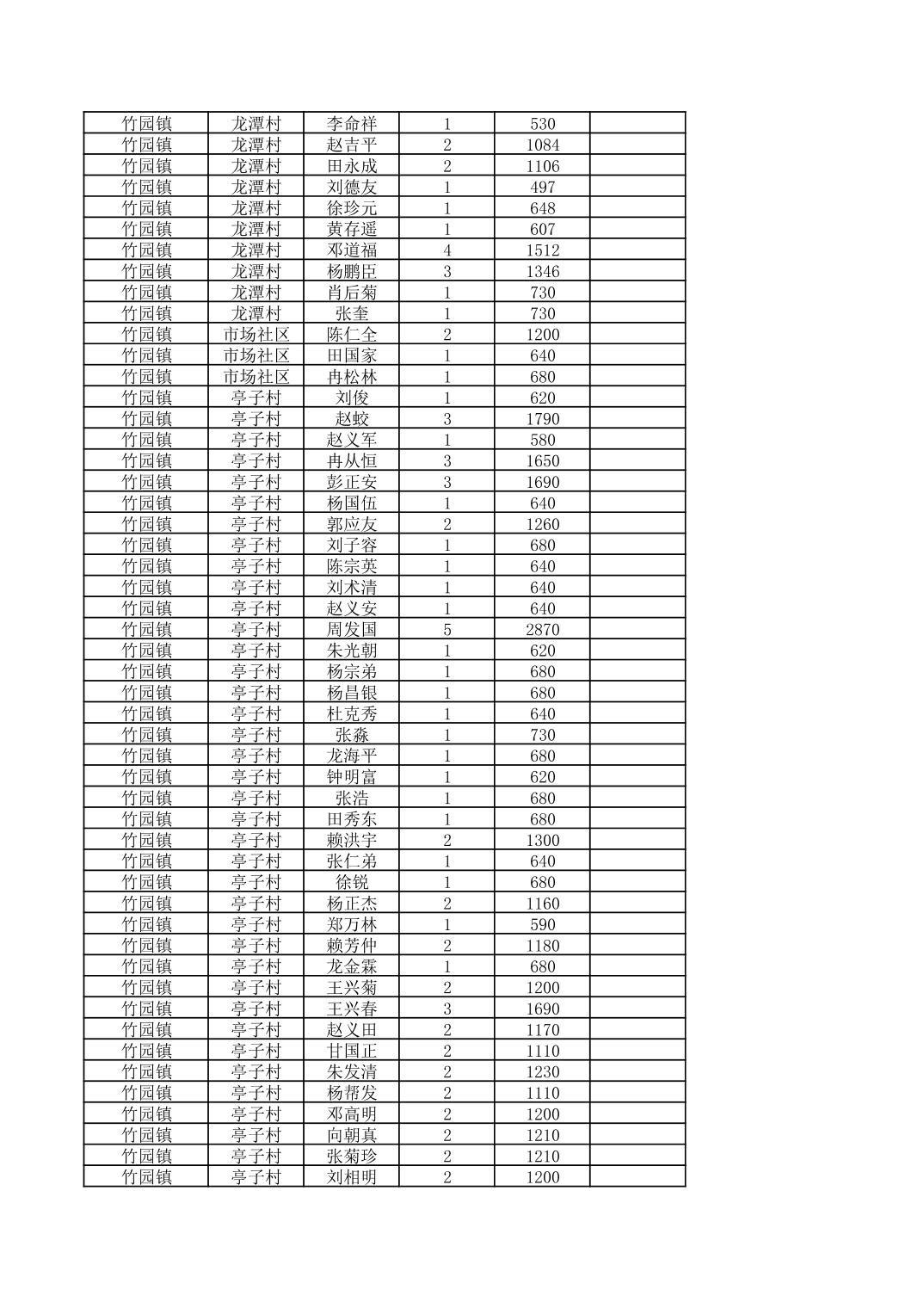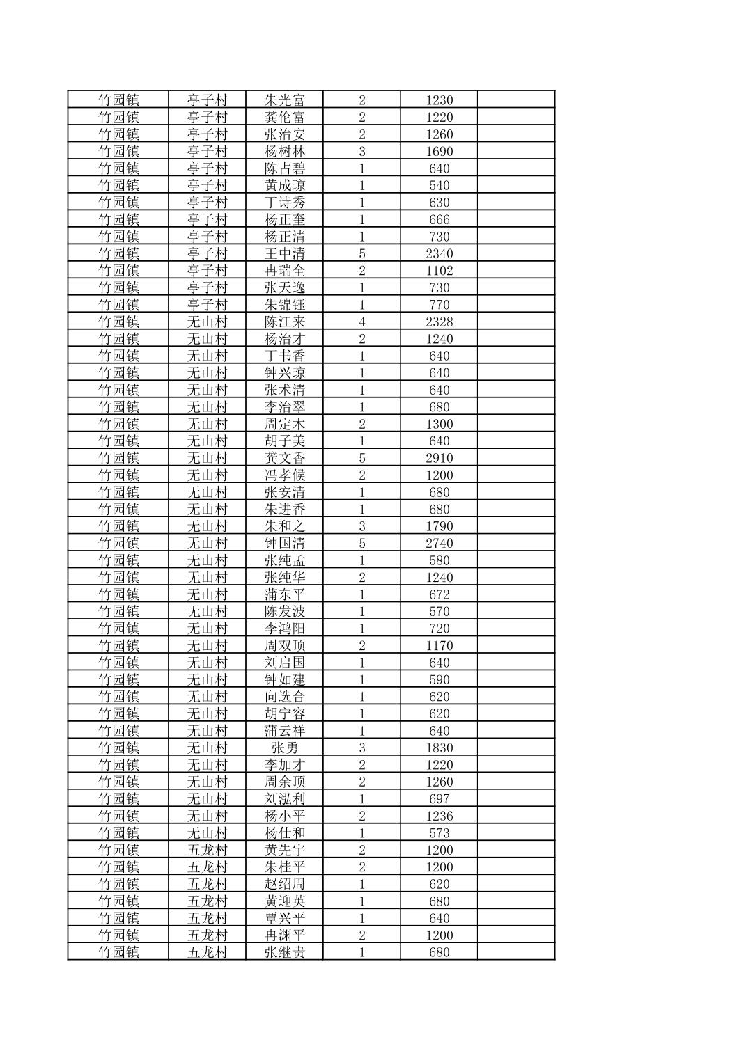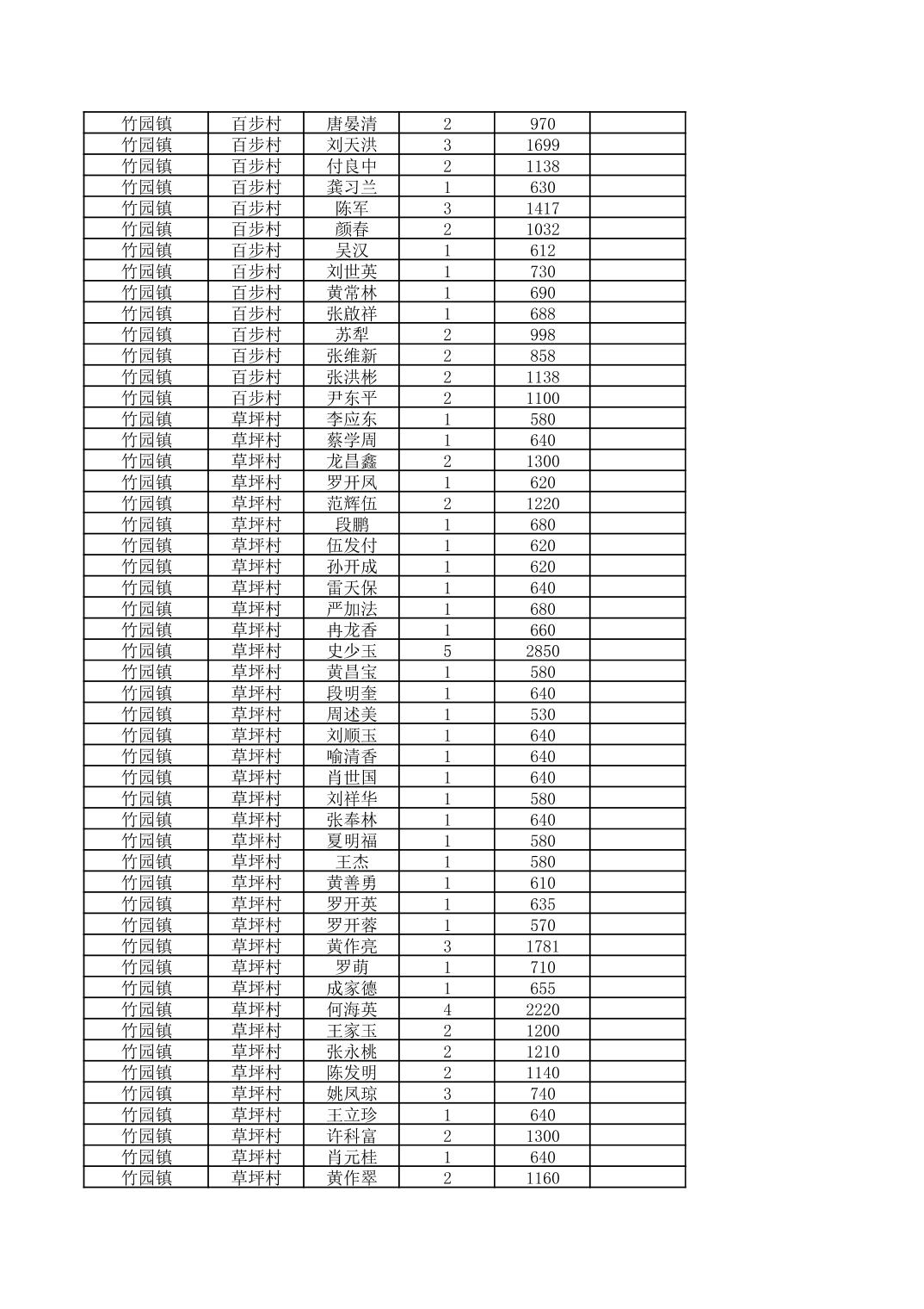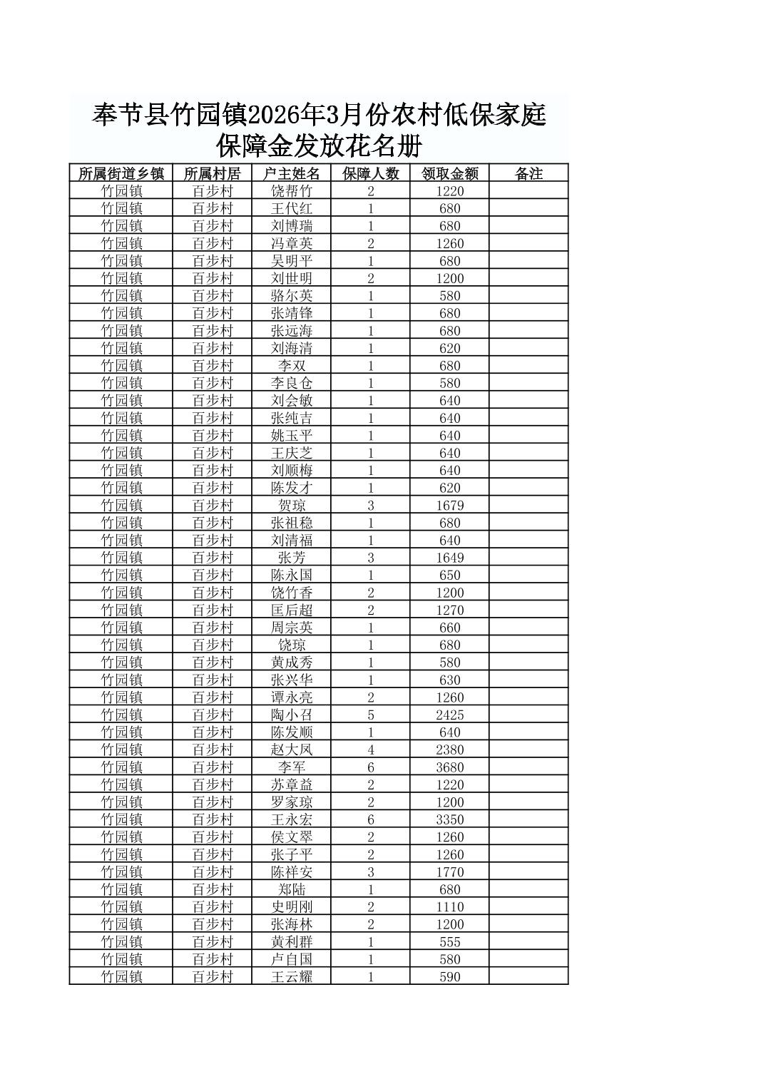 奉节县竹园镇2026年3月份农村低保家庭保障金发放花名册
