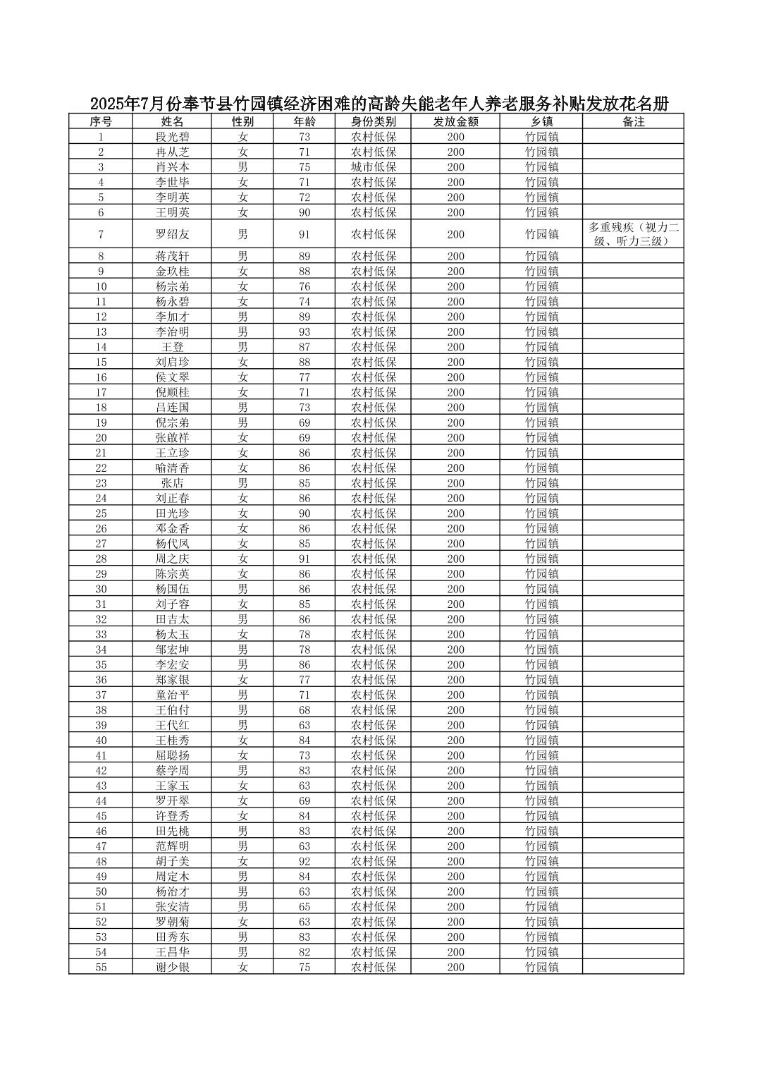 2025年7月份奉节县竹园镇经济困难的高龄失能老年人养老服务补贴发放花名册