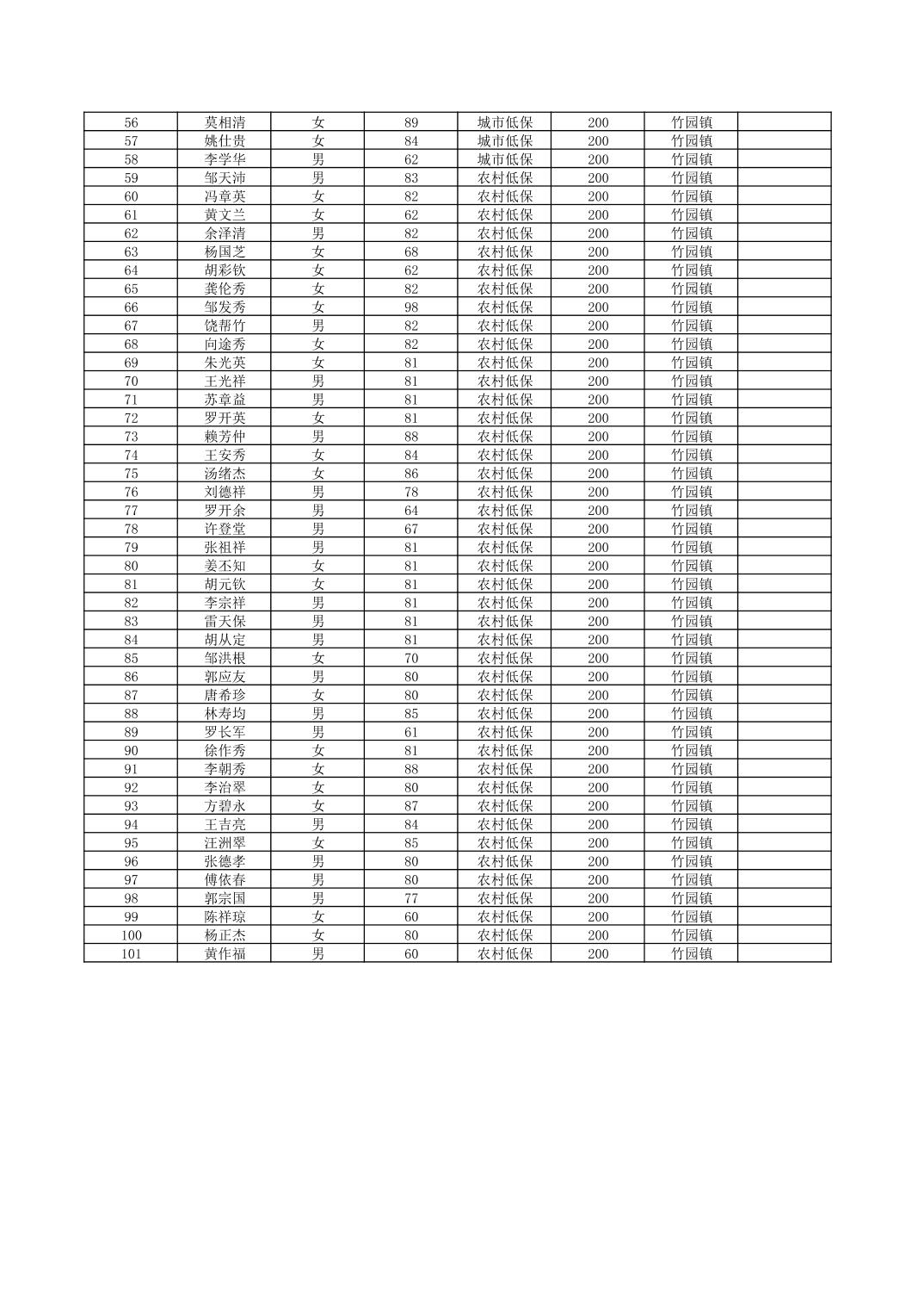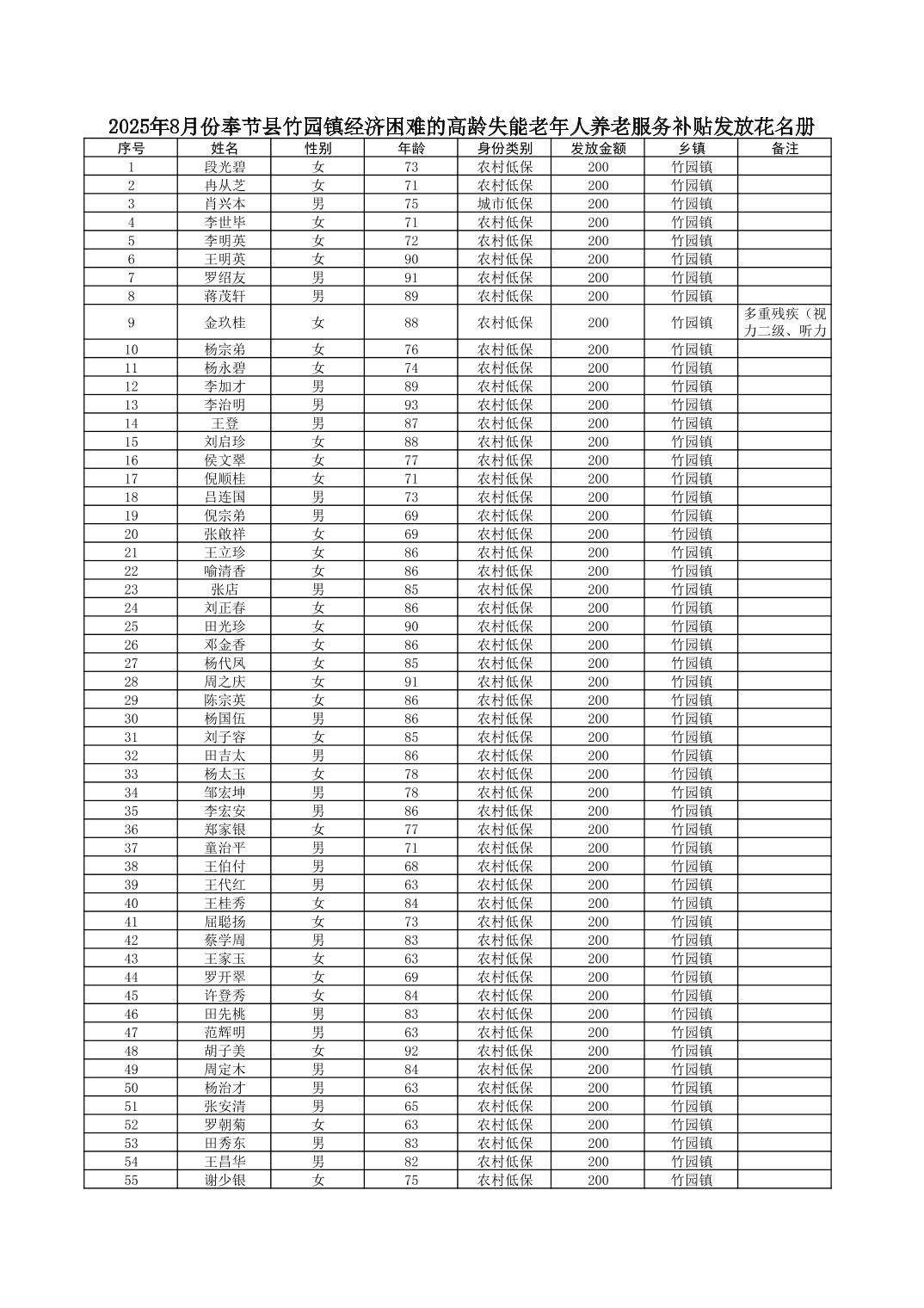 2025年8月份奉节县竹园镇经济困难的高龄失能老年人养老服务补贴发放花名册