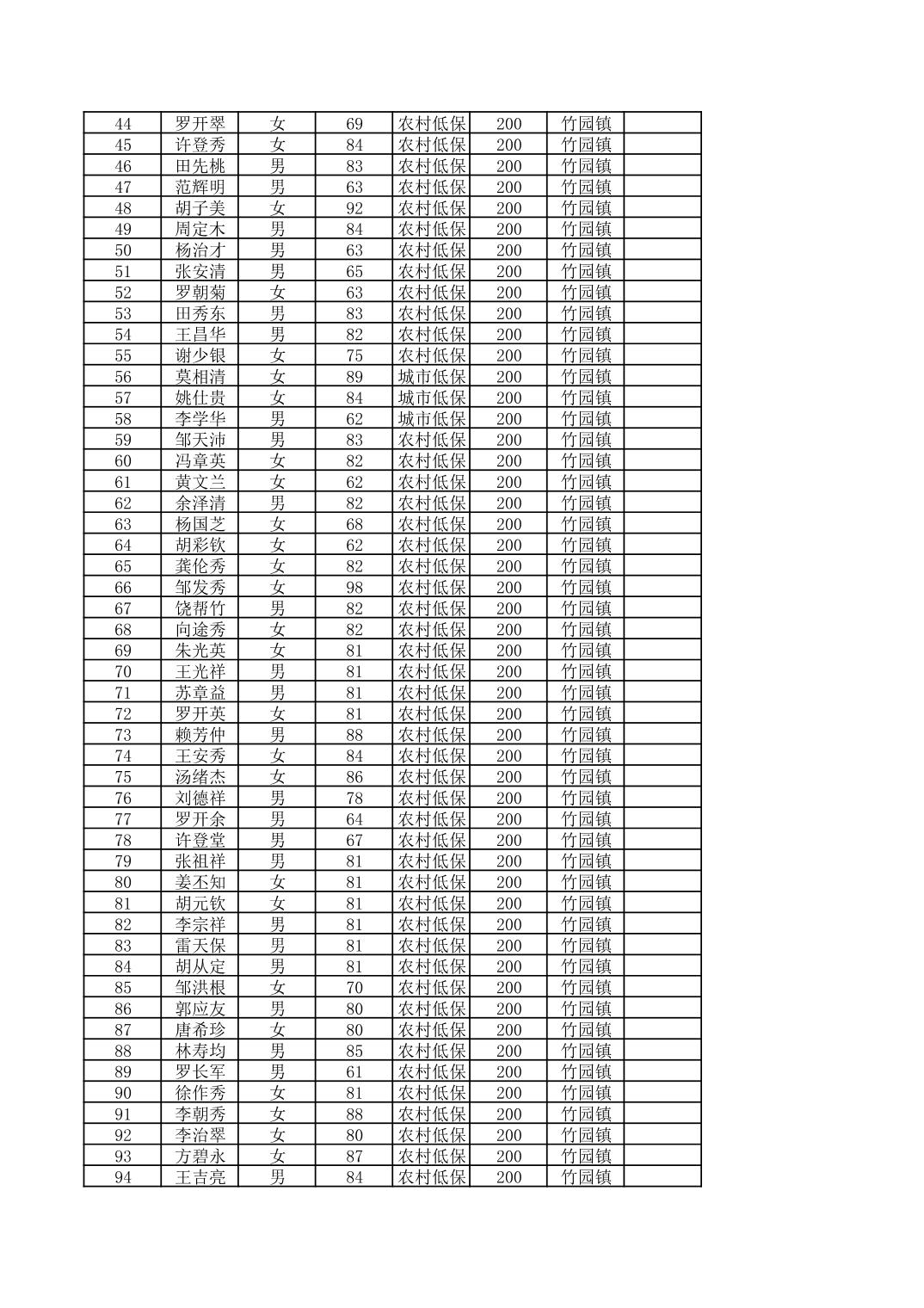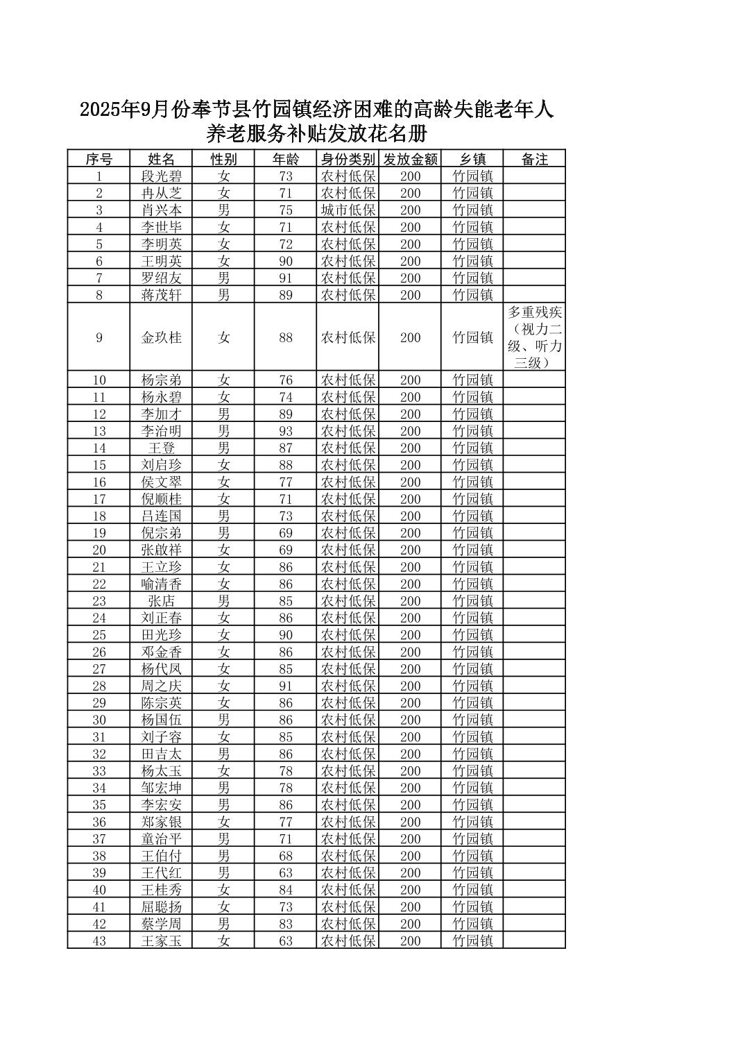 2025年9月份奉节县竹园镇经济困难的高龄失能老年人养老服务补贴发放花名册
