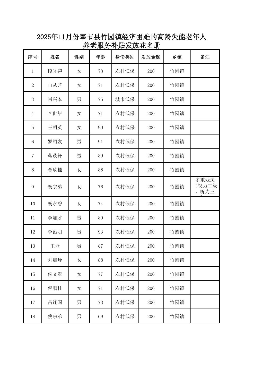2025年11月份奉节县竹园镇经济困难的高龄失能老年人养老服务补贴发放花名册