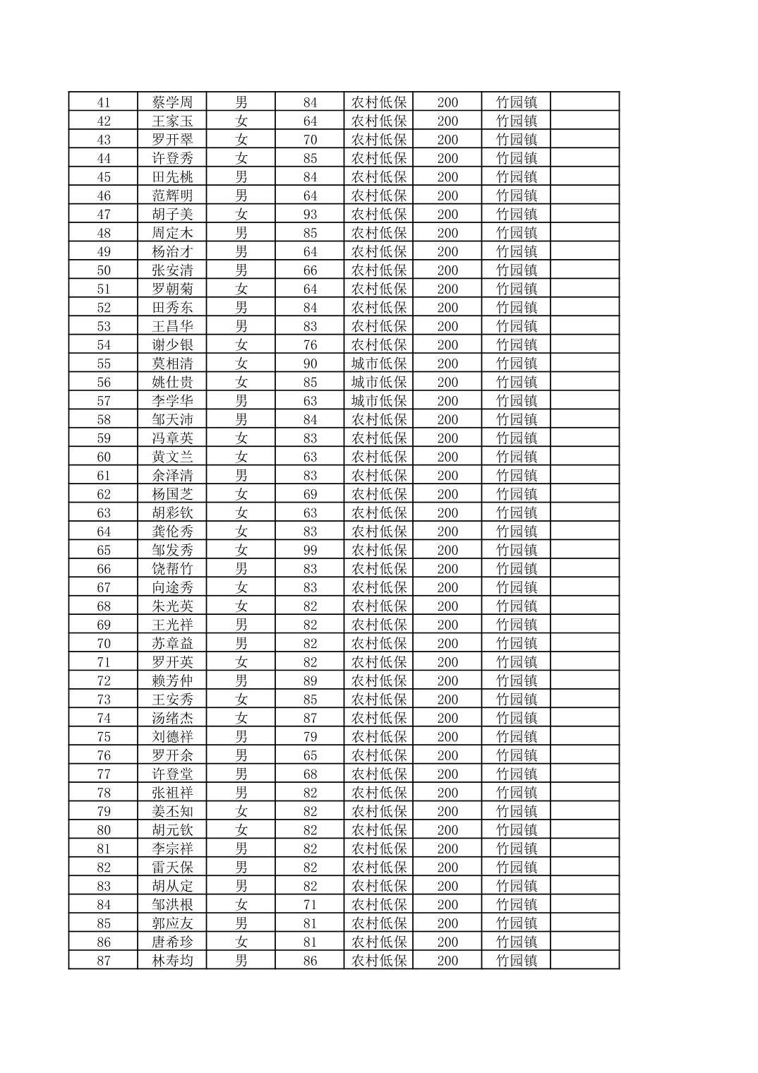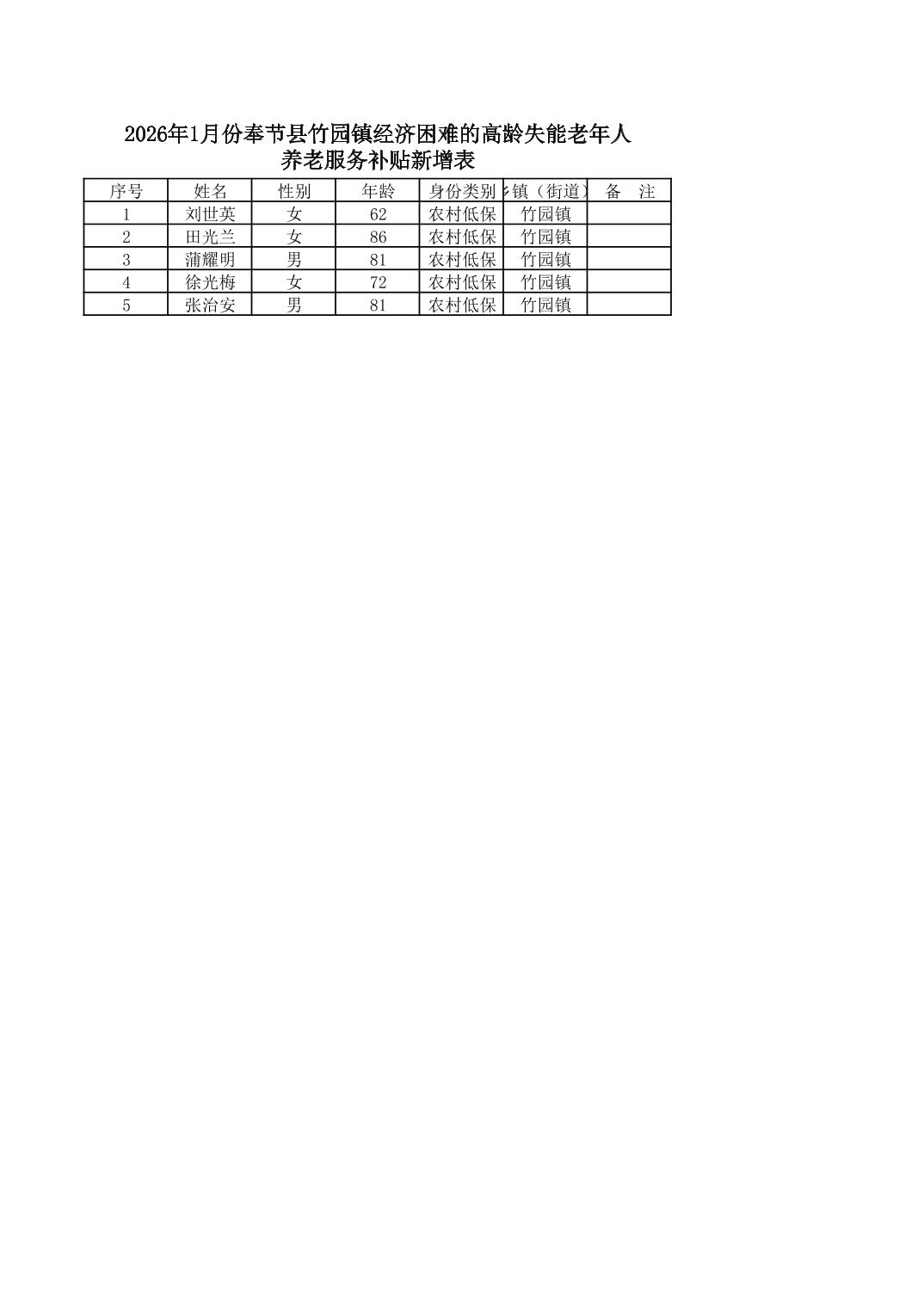 2026年1月份奉节县竹园镇经济困难的高龄失能老年人 养老服务补贴发放花名册
