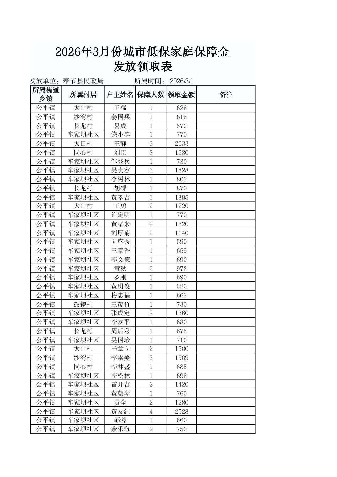 公平镇2026年3月份城市低保家庭保障金发放领取表