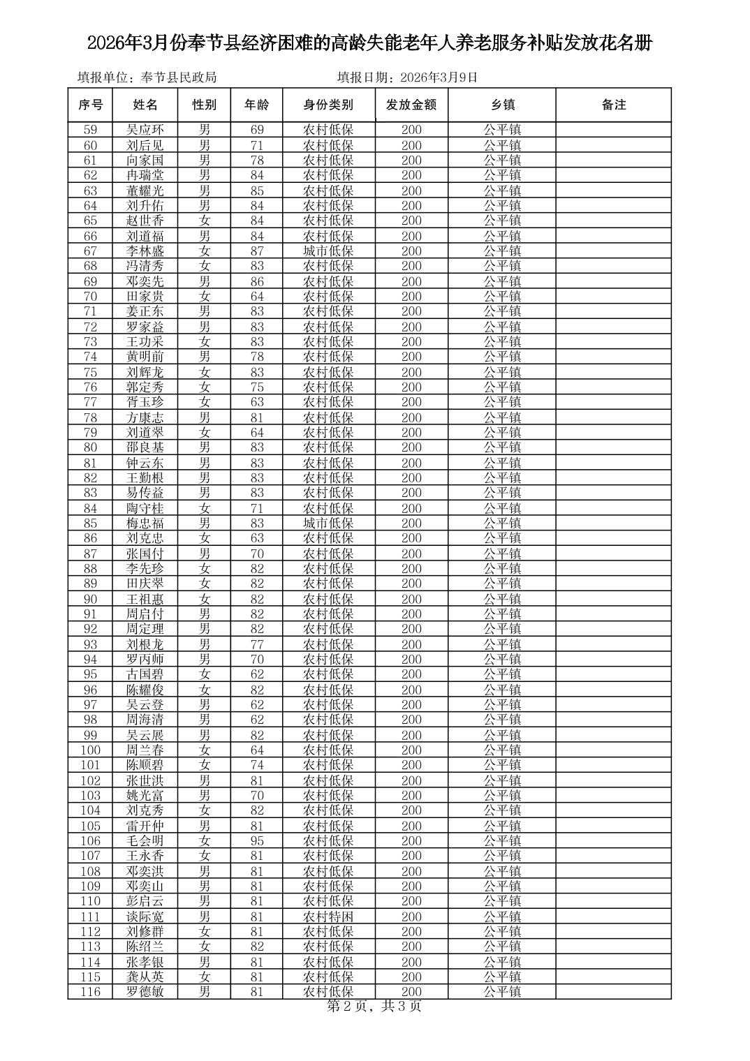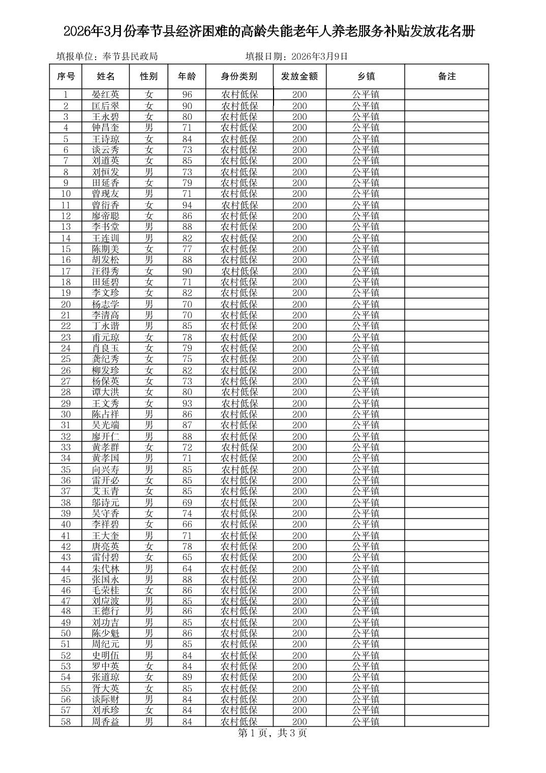 2026年3月份奉节县公平镇经济困难的高龄失能老年人养老服务补贴发放花名册