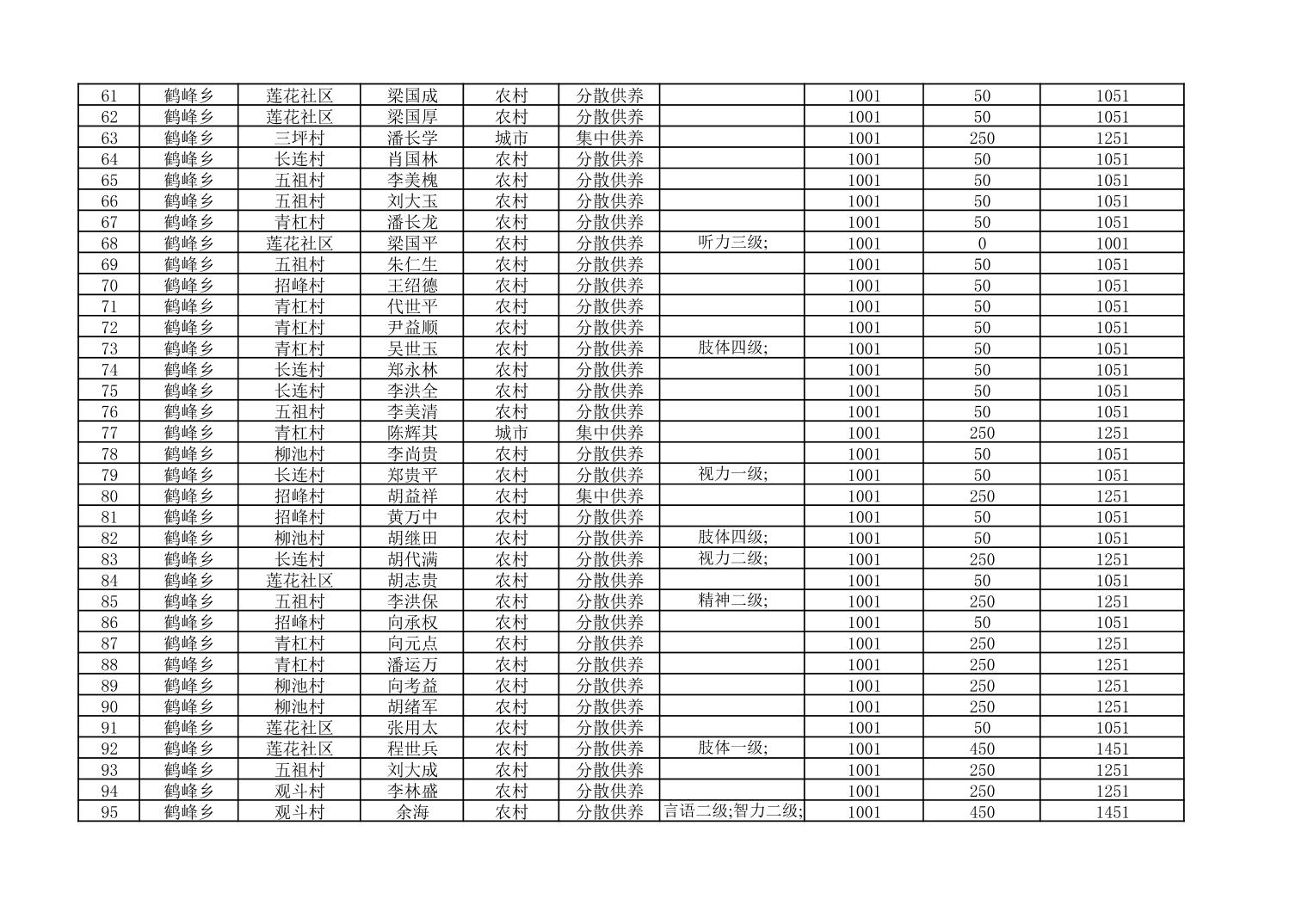鹤峰乡2025年城乡特困人员12月基本生活补贴发放花名册