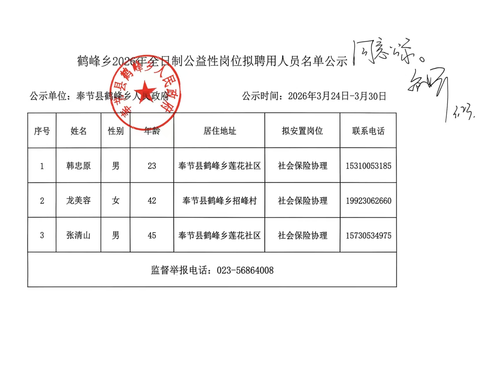 鹤峰乡2026年全日制公益性岗位拟聘用人员名单公示