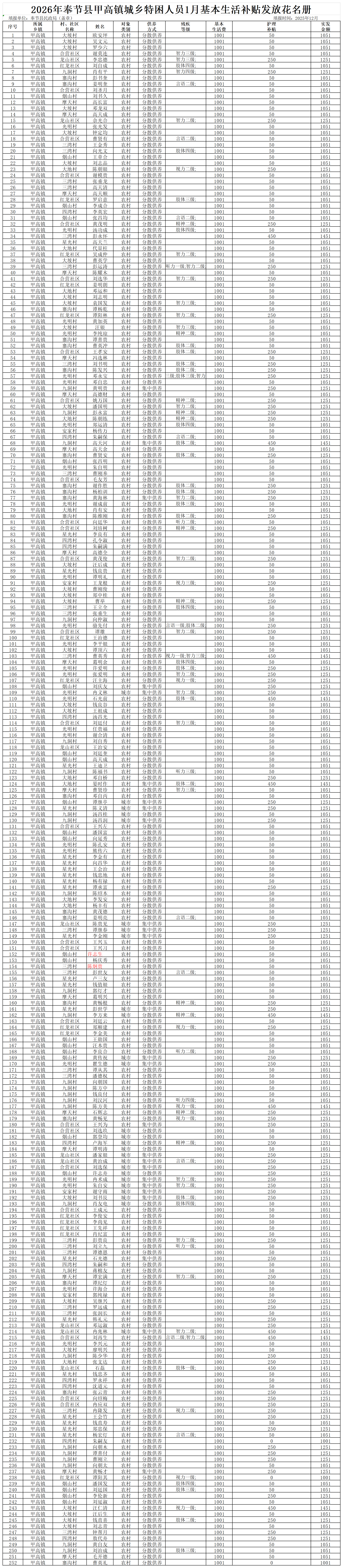 2026年奉节县甲高镇城乡特困人员1月基本生活补贴发放花名册