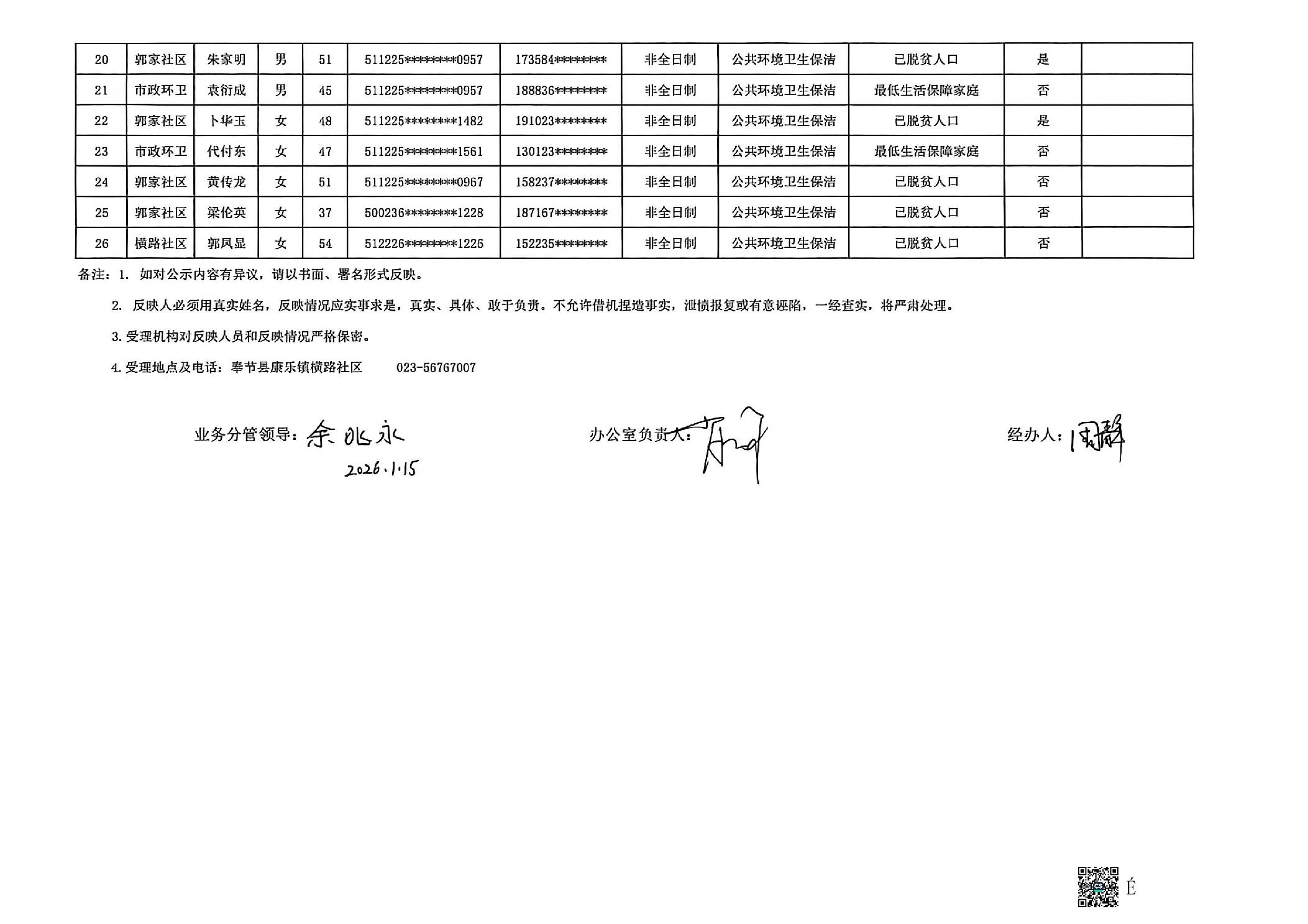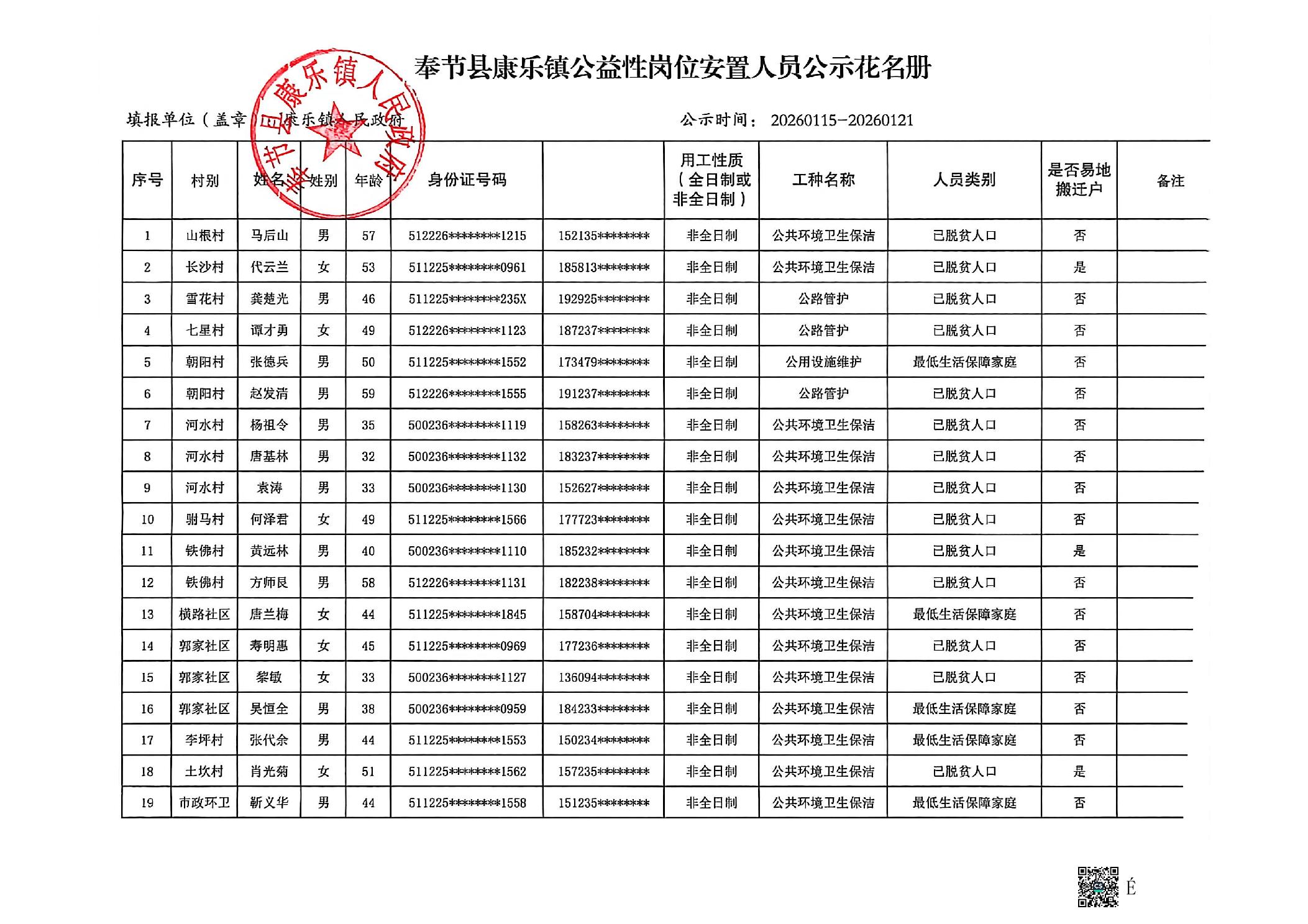 奉节县康乐镇公益性岗位安置人员公示花名册