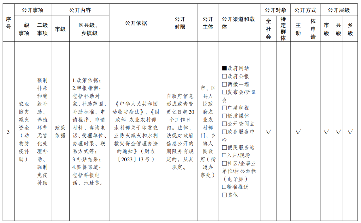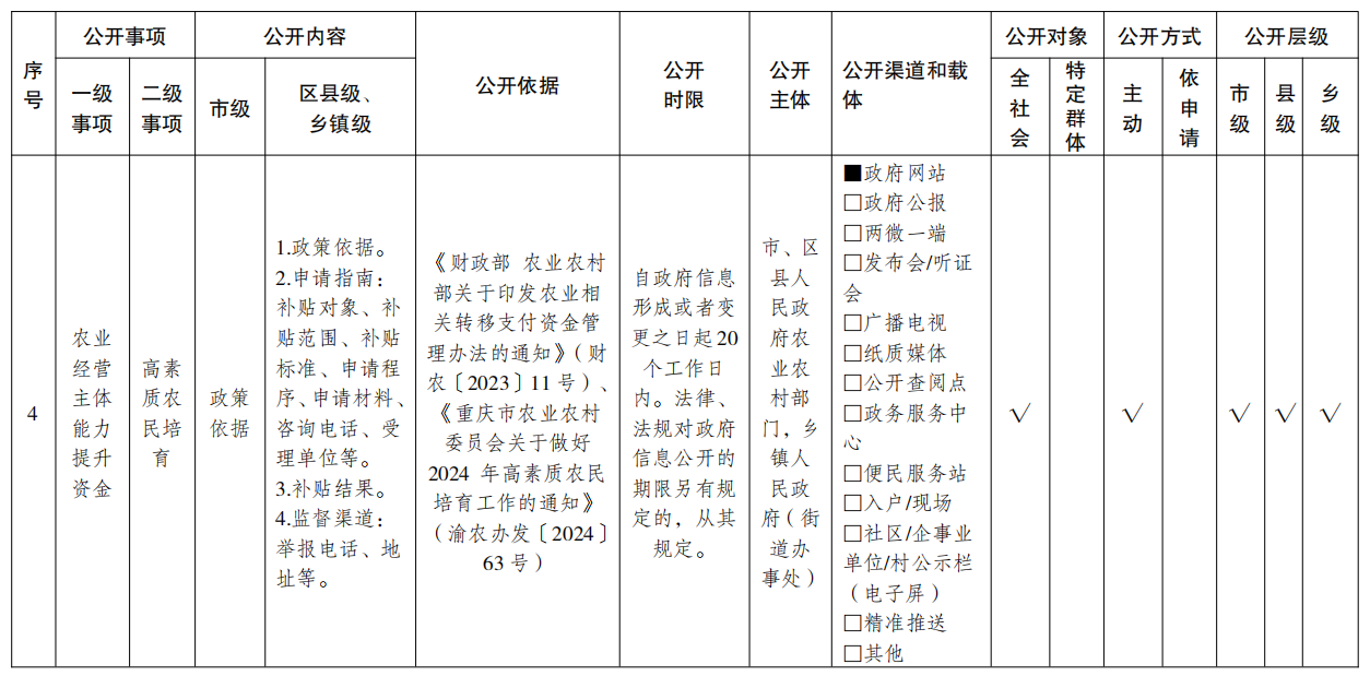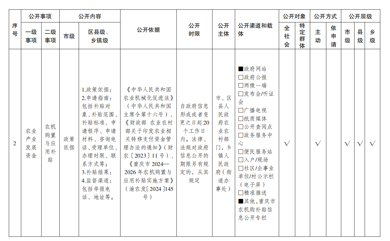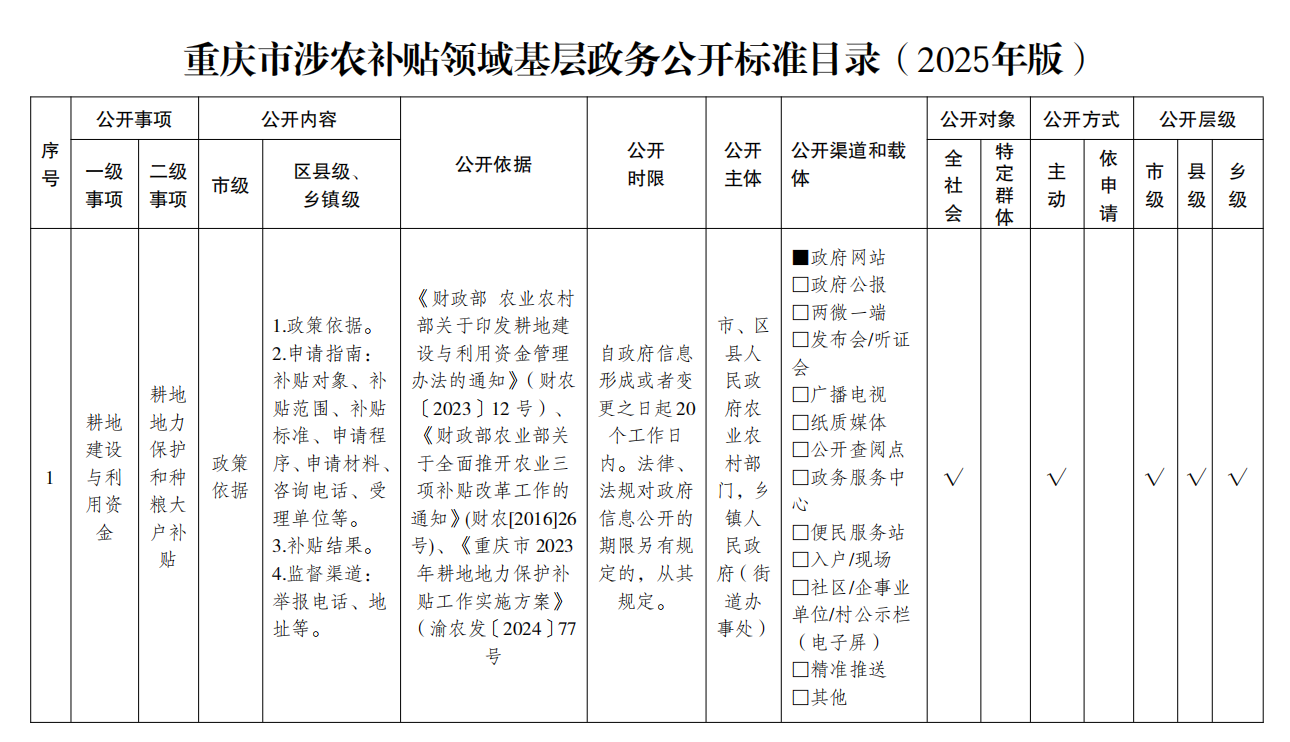 重庆市涉农补贴领域基层政务公开标准目录(2025年版)
