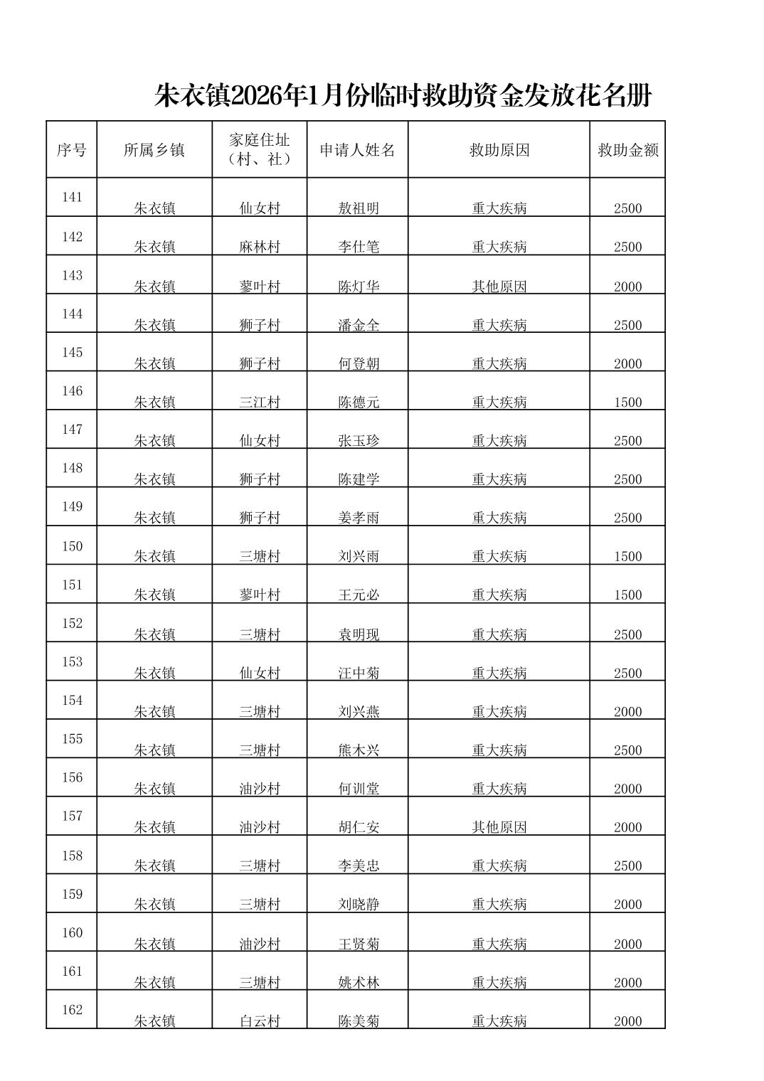 朱衣镇2026年1月份临时救助资金发放花名册