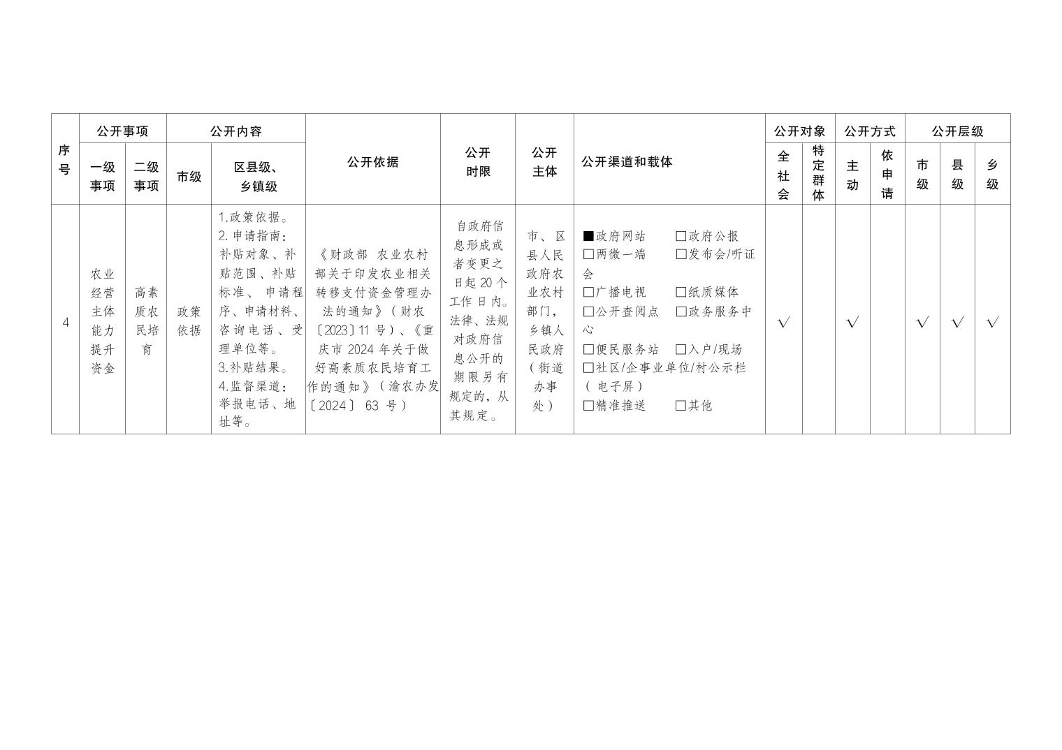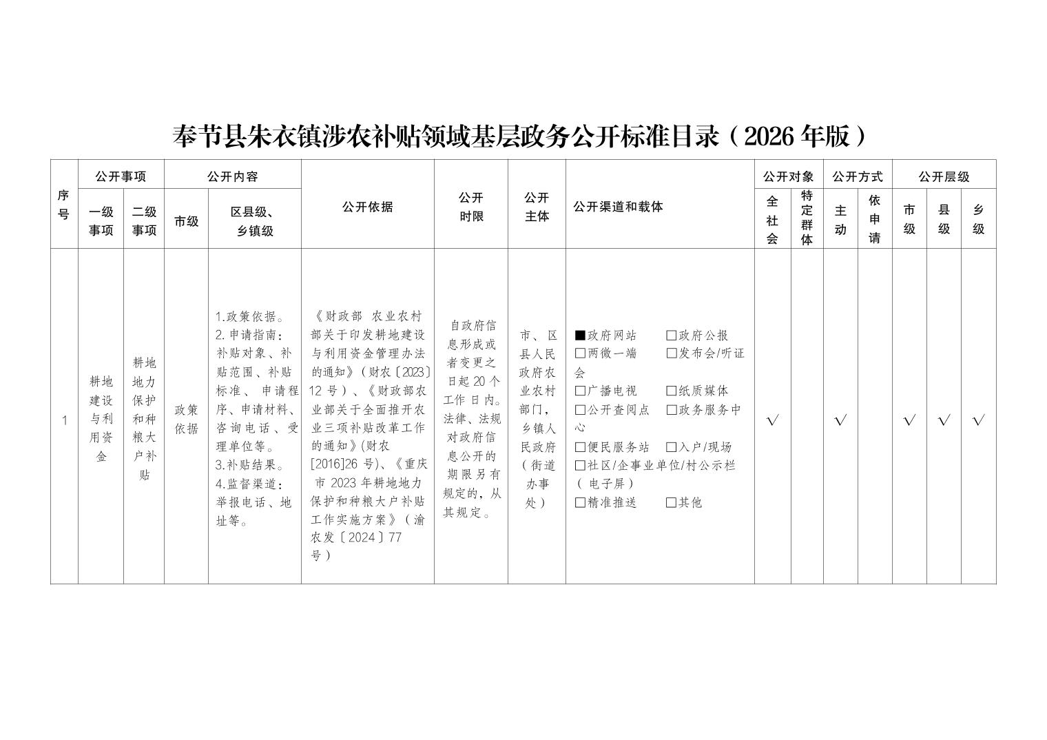 奉节县朱衣镇涉农补贴领域基层政务公开标准目录(2026 年版)