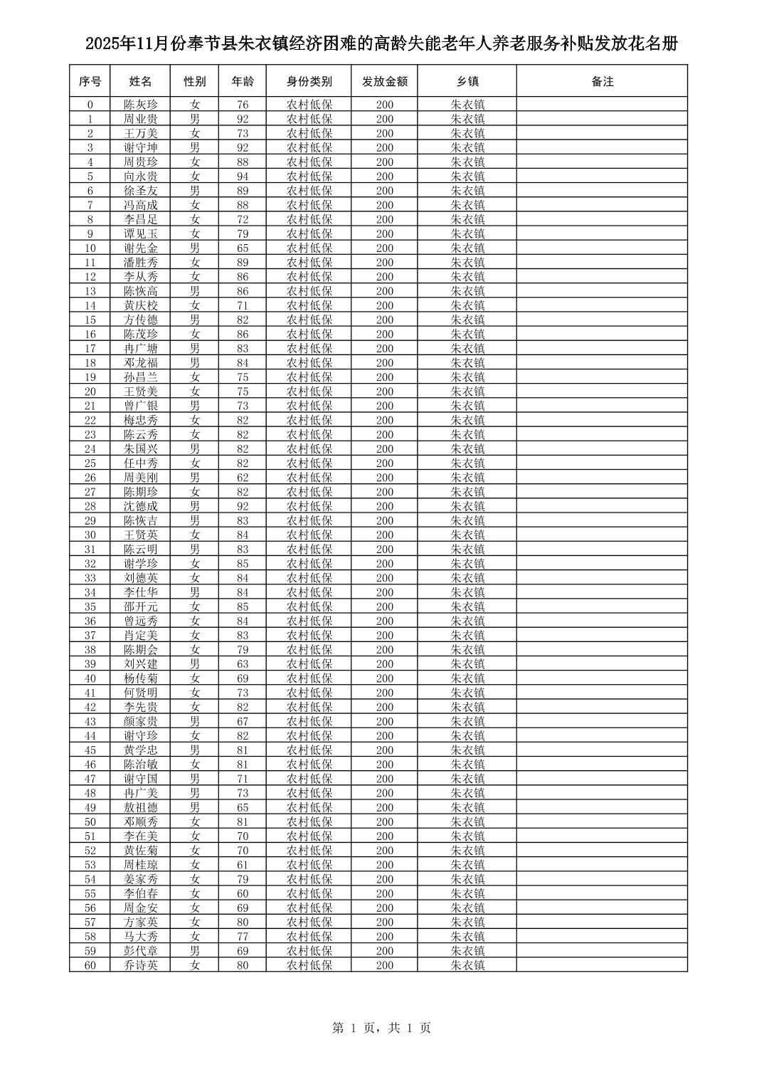 2025年11月份奉节县朱衣镇经济困难的高龄失能老年人养老服务补贴发放花名册