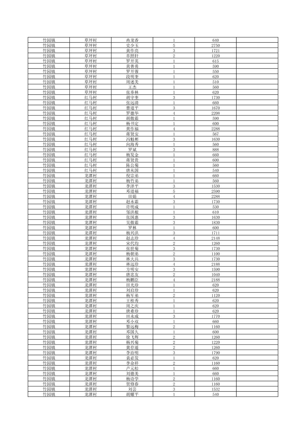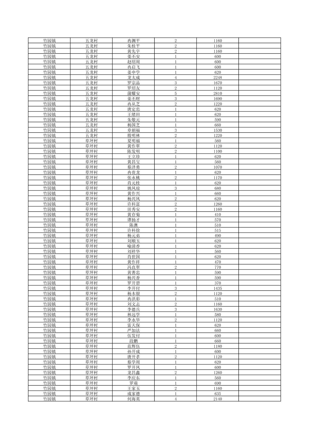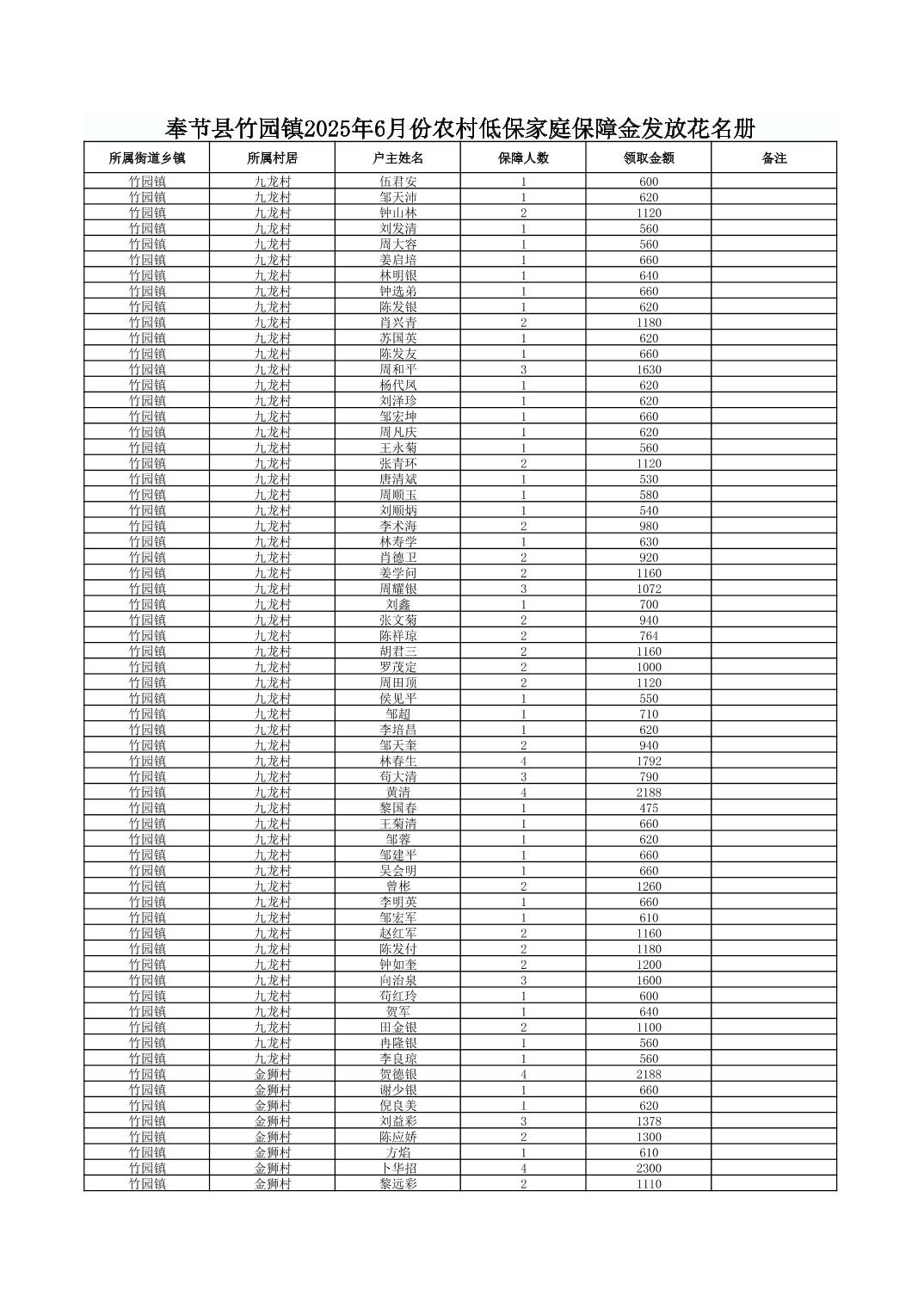 奉节县竹园镇2025年6月份农村低保家庭保障金发放花名册