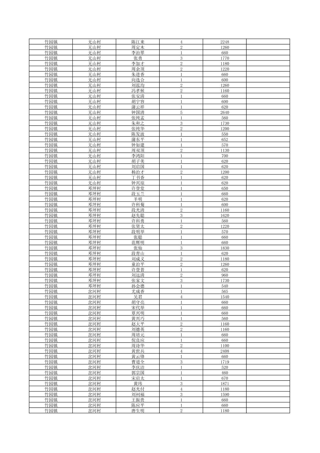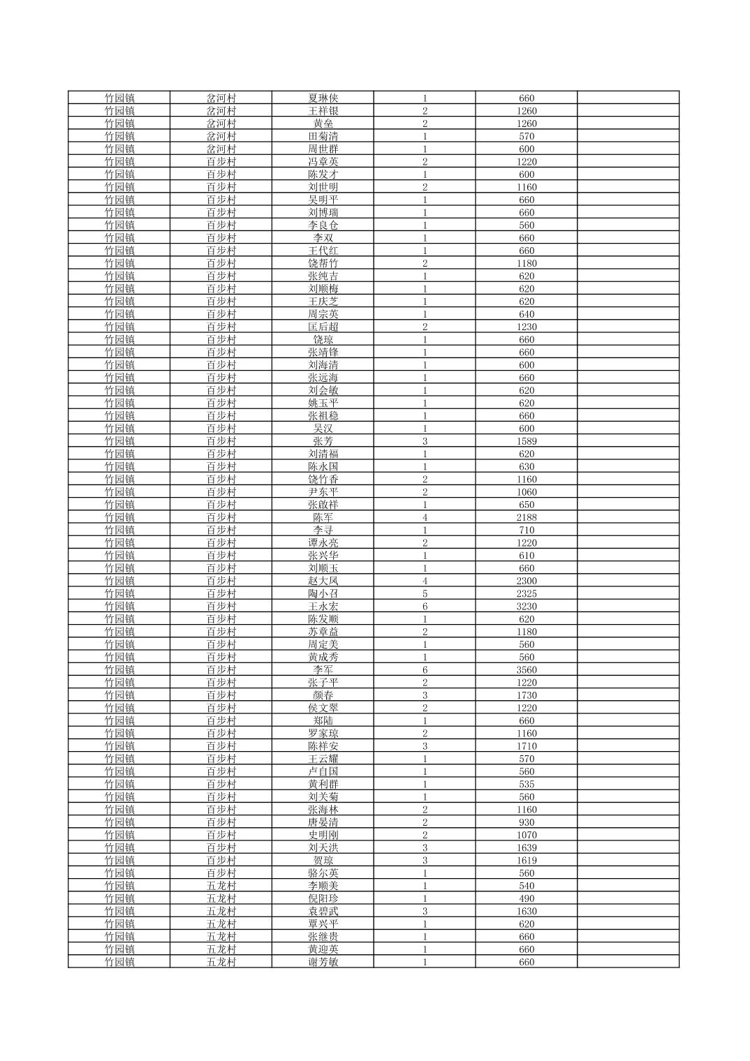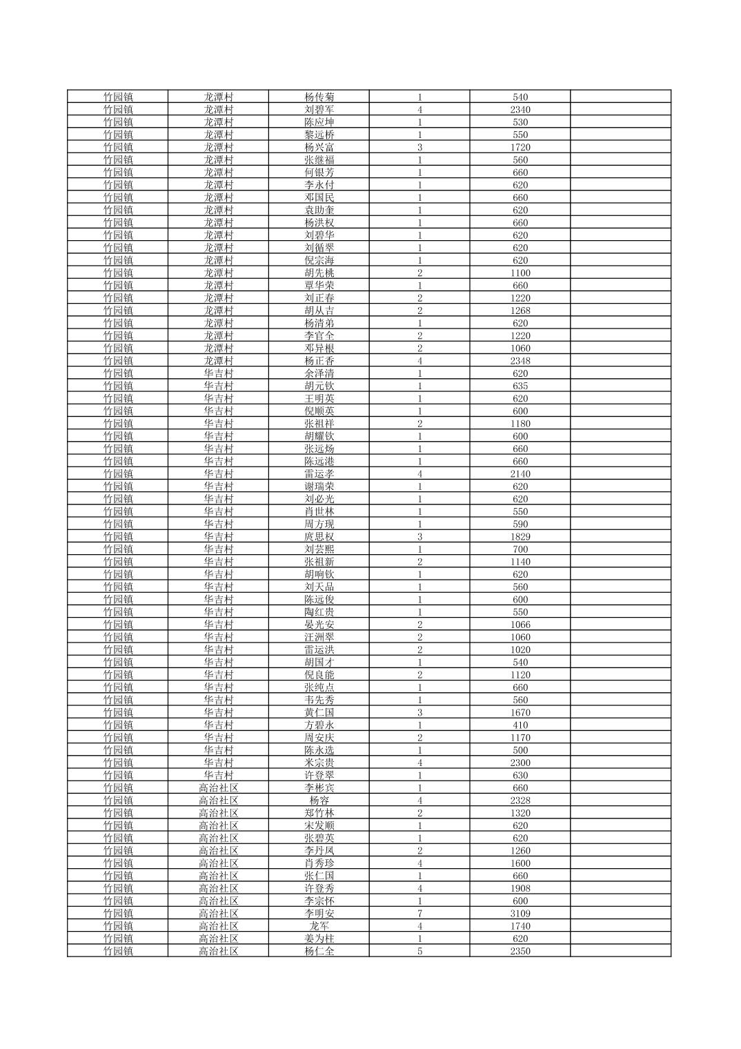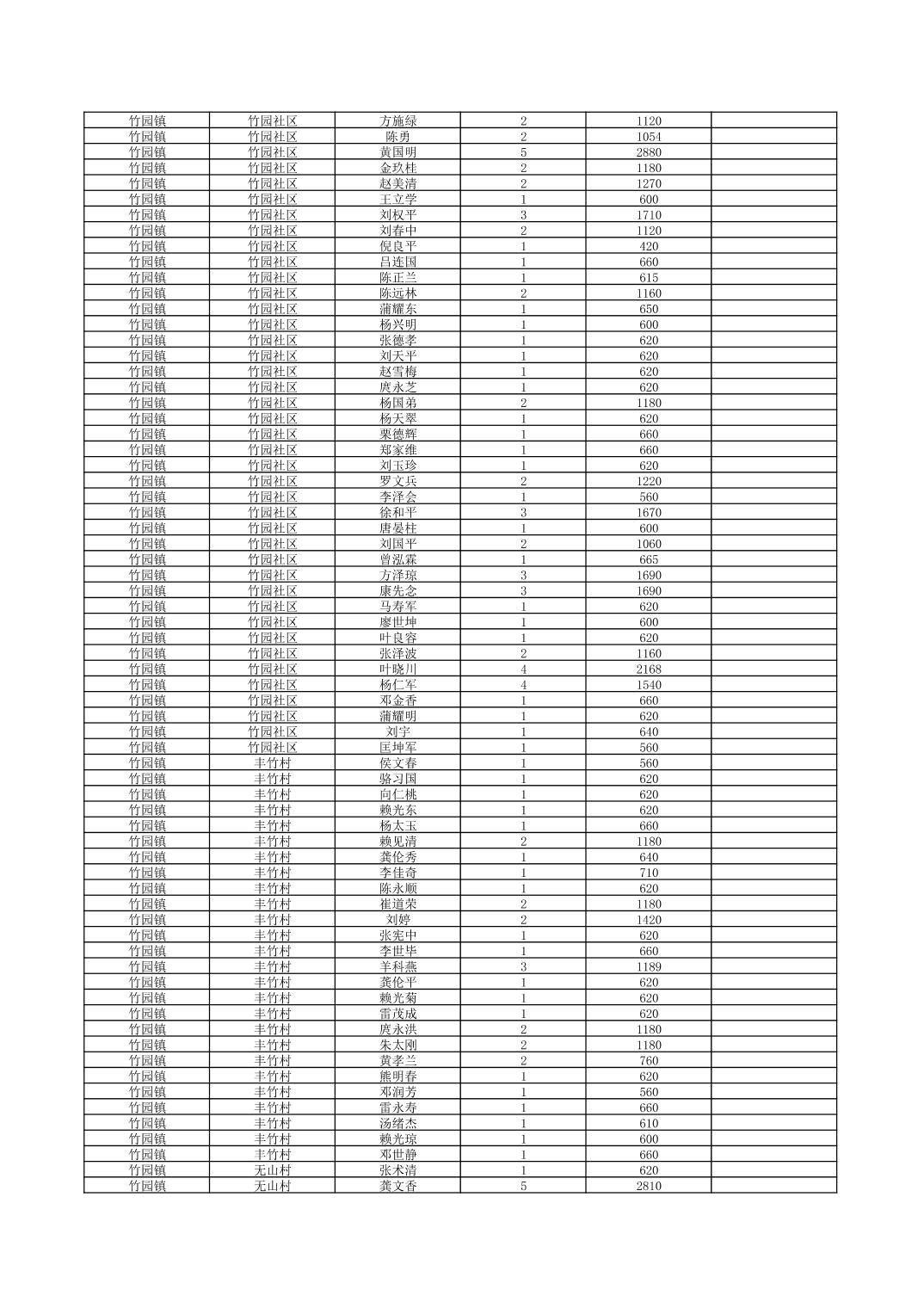 奉节县竹园镇2025年6月份农村低保家庭保障金发放花名册