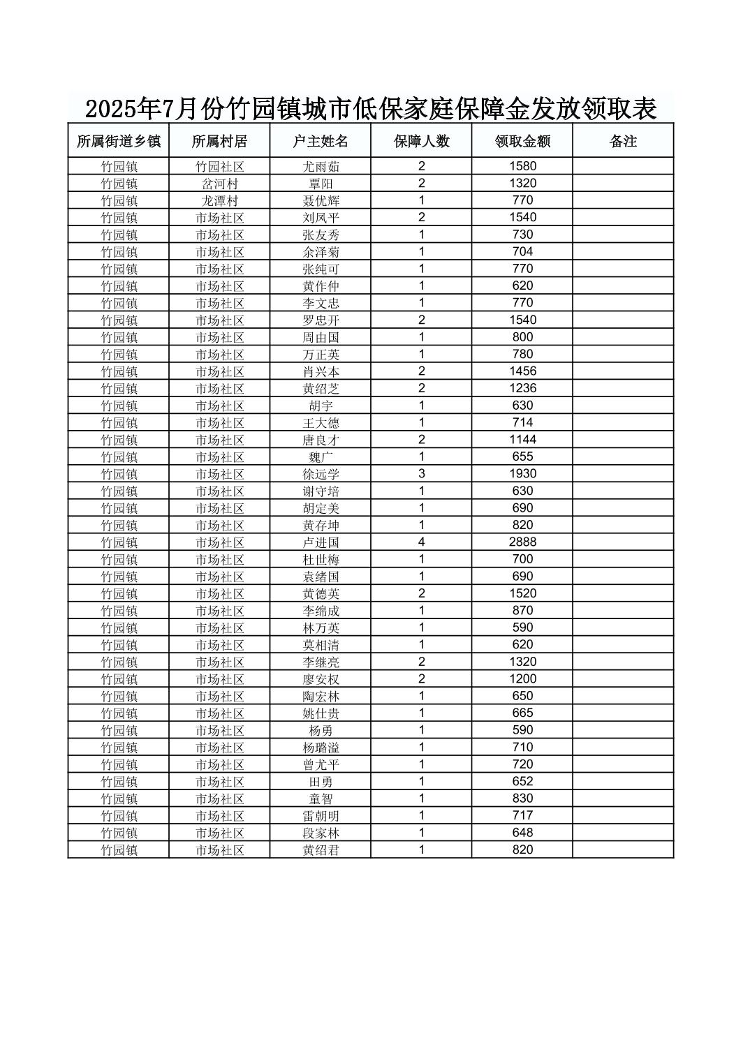 2025年7月份竹园镇城市低保家庭保障金发放领取表