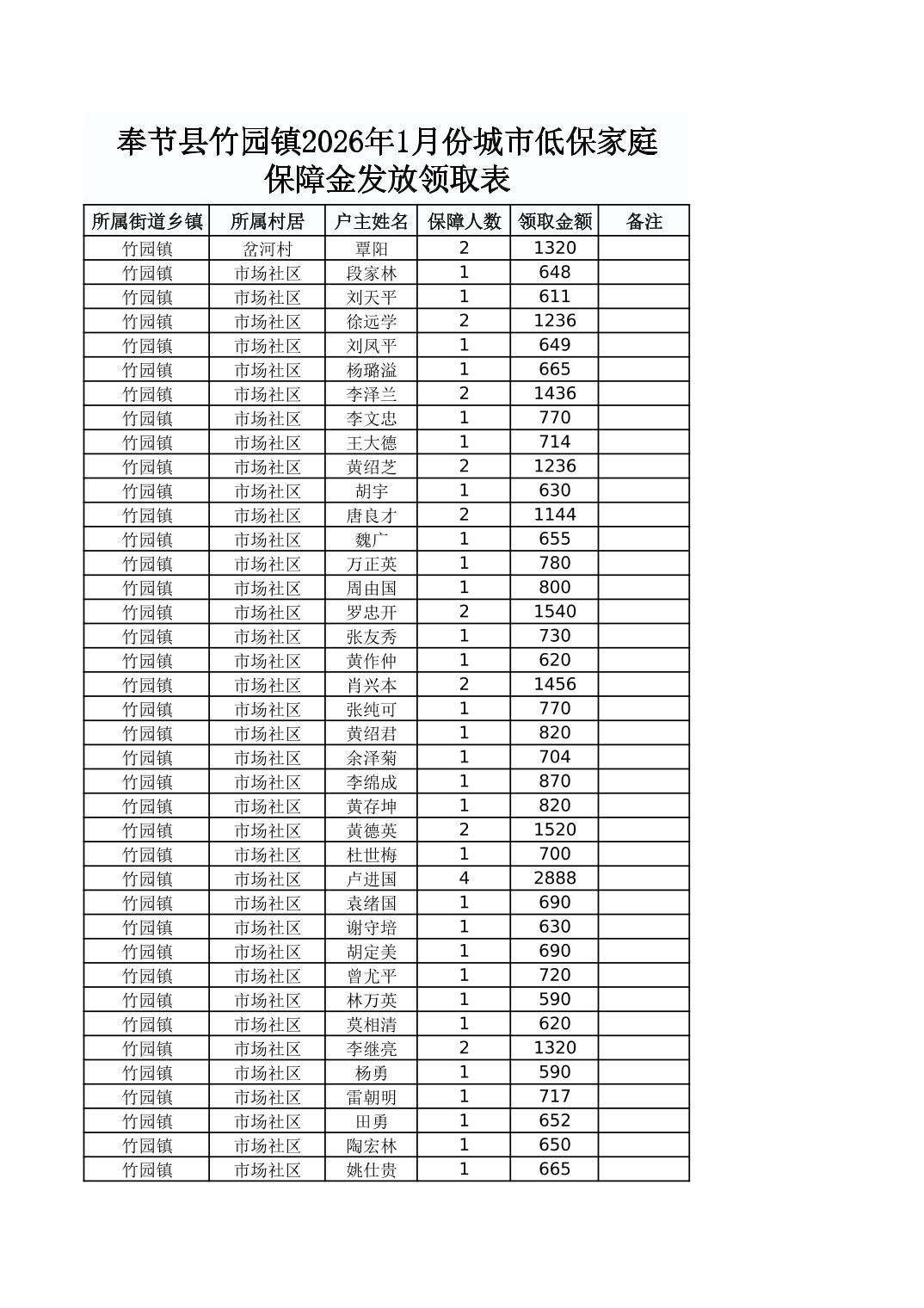 奉节县竹园镇2026年1月份城市低保家庭保障金发放领取表
