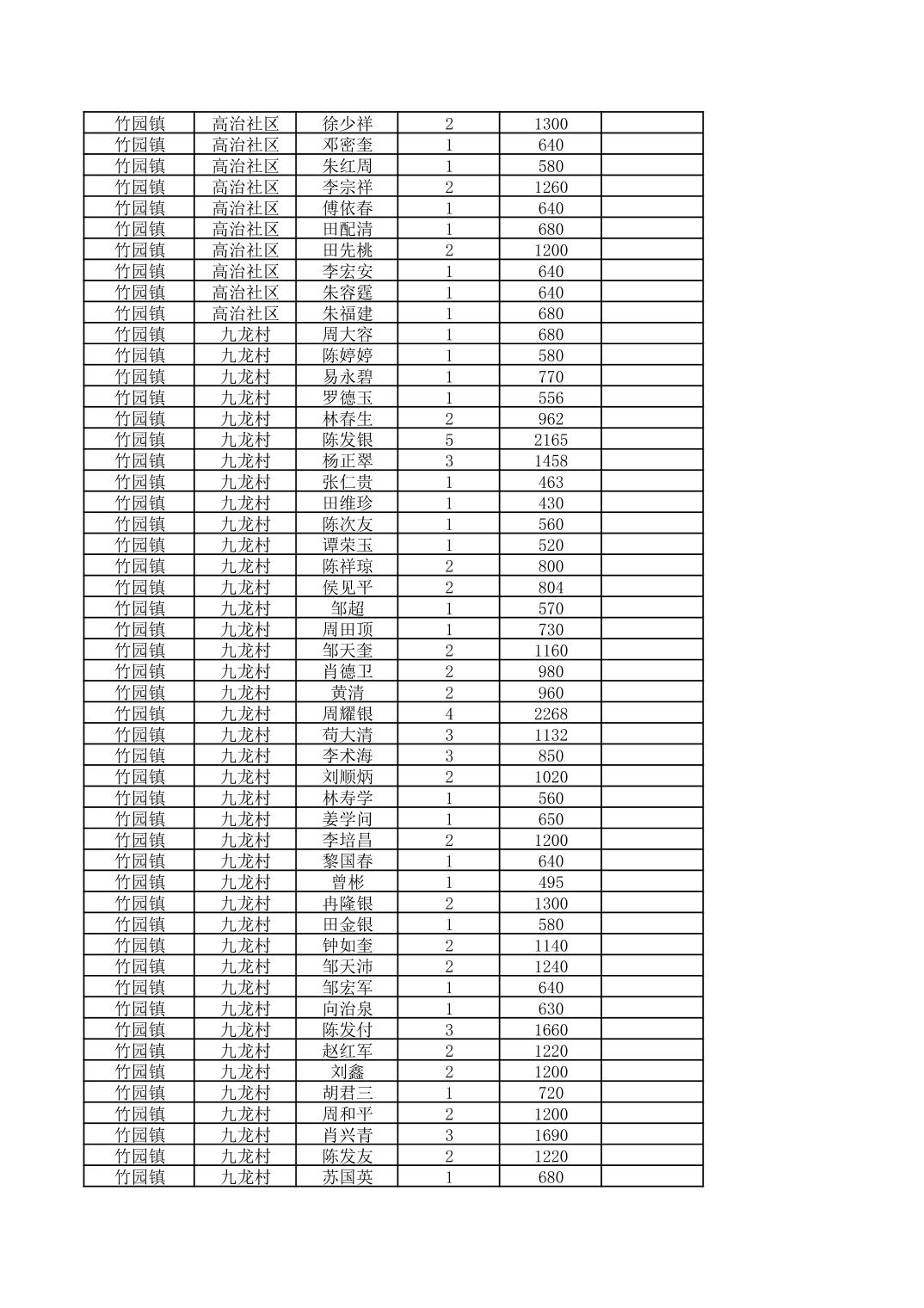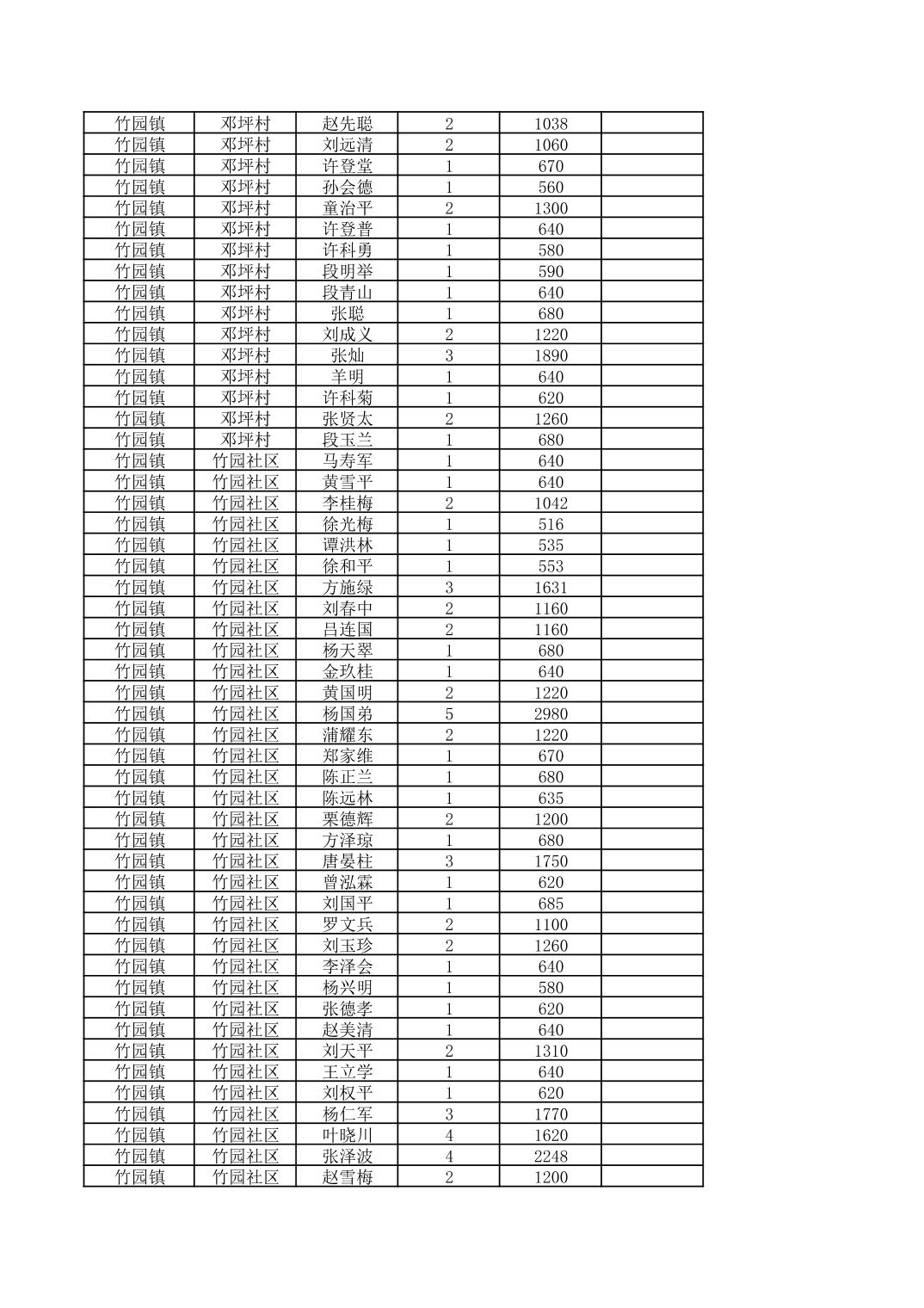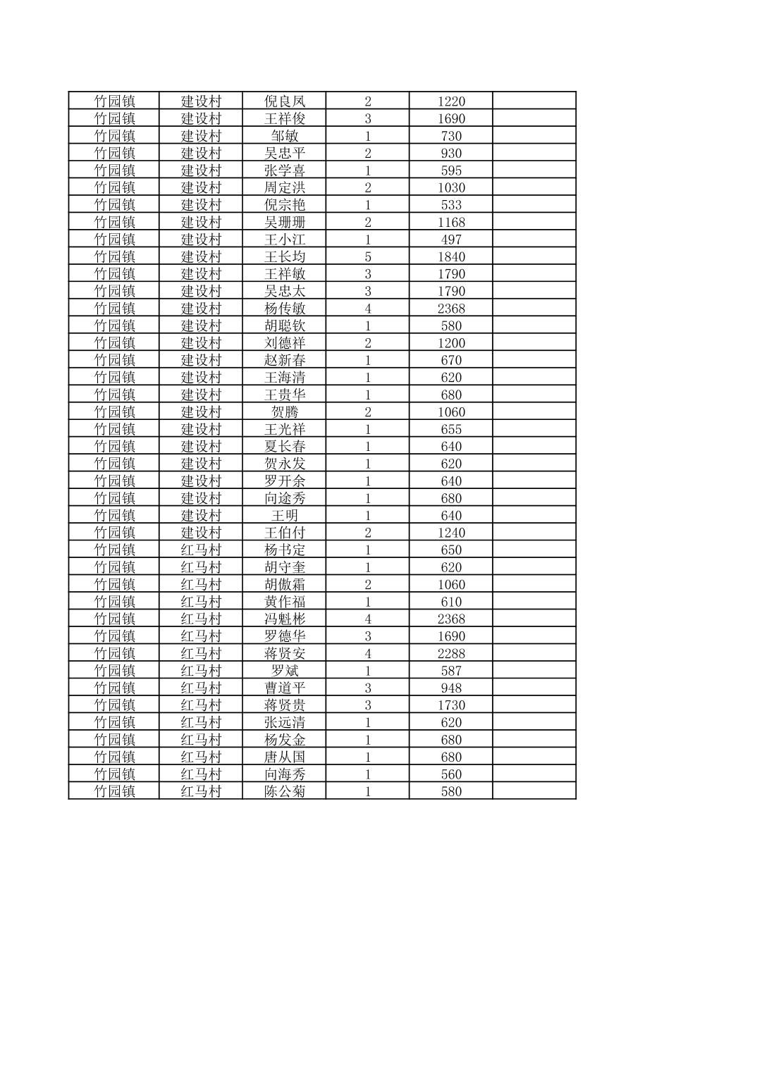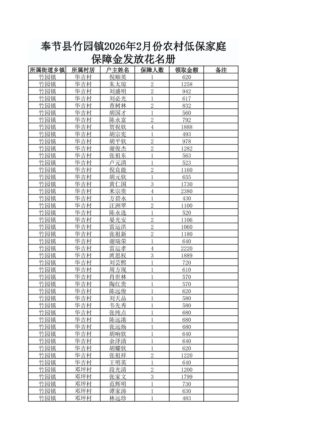 奉节县竹园镇2026年2月份农村低保家庭保障金发放花名册