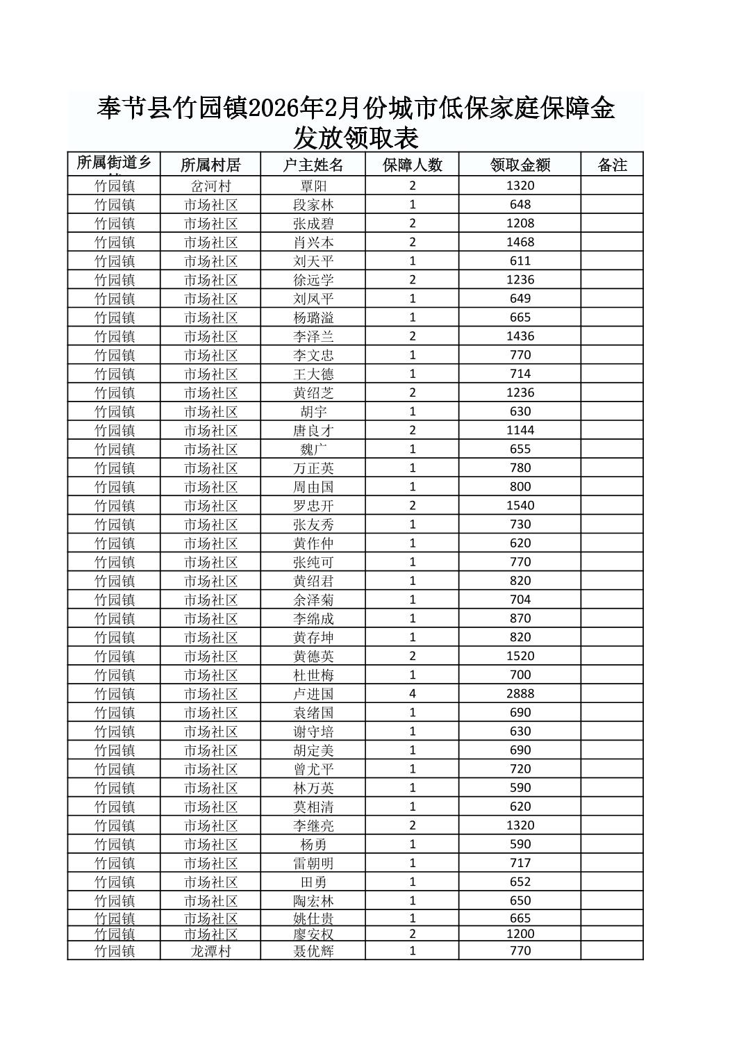 奉节县竹园镇2026年2月份城市低保家庭保障金发放领取表