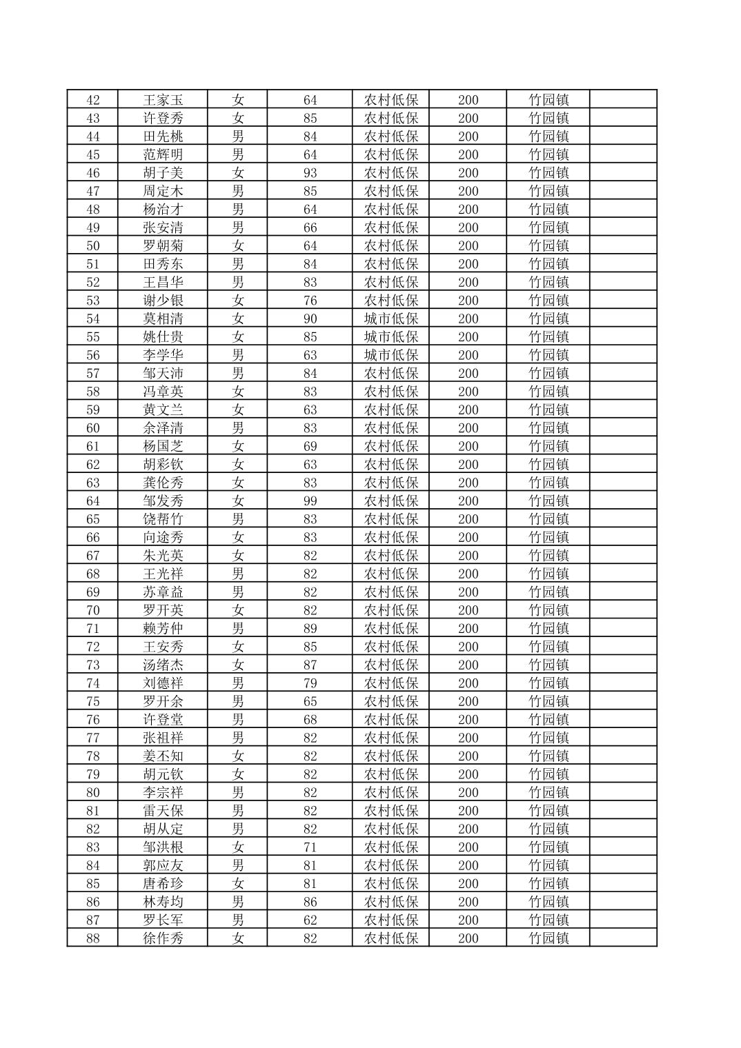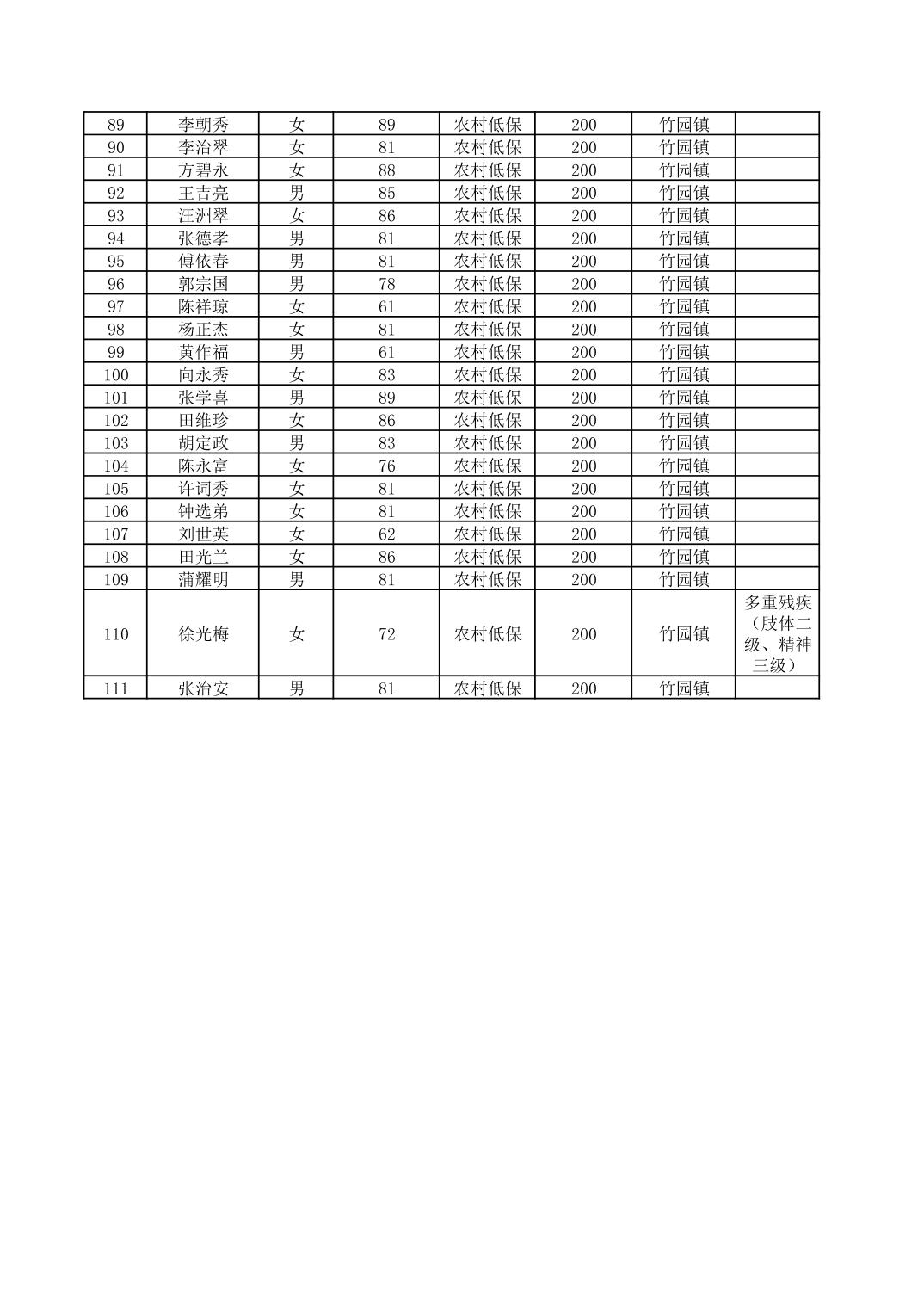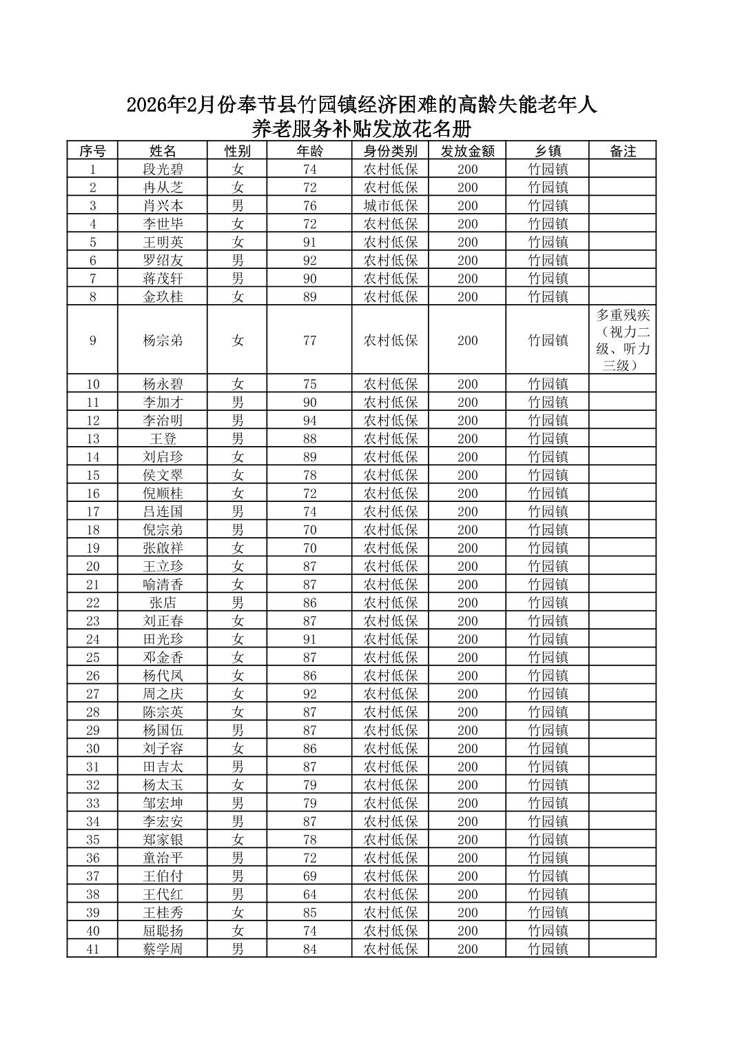 2026年2月奉节县竹园镇经济困难的高龄失能老人养老服务补贴花名册