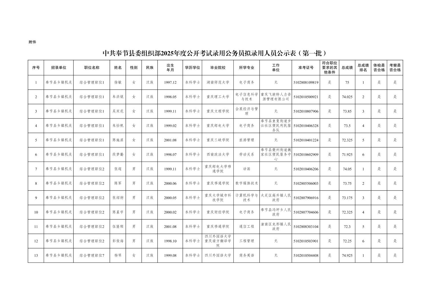 中共奉节县委组织部 2025 年度公开考试录用公务员拟录用人员公示