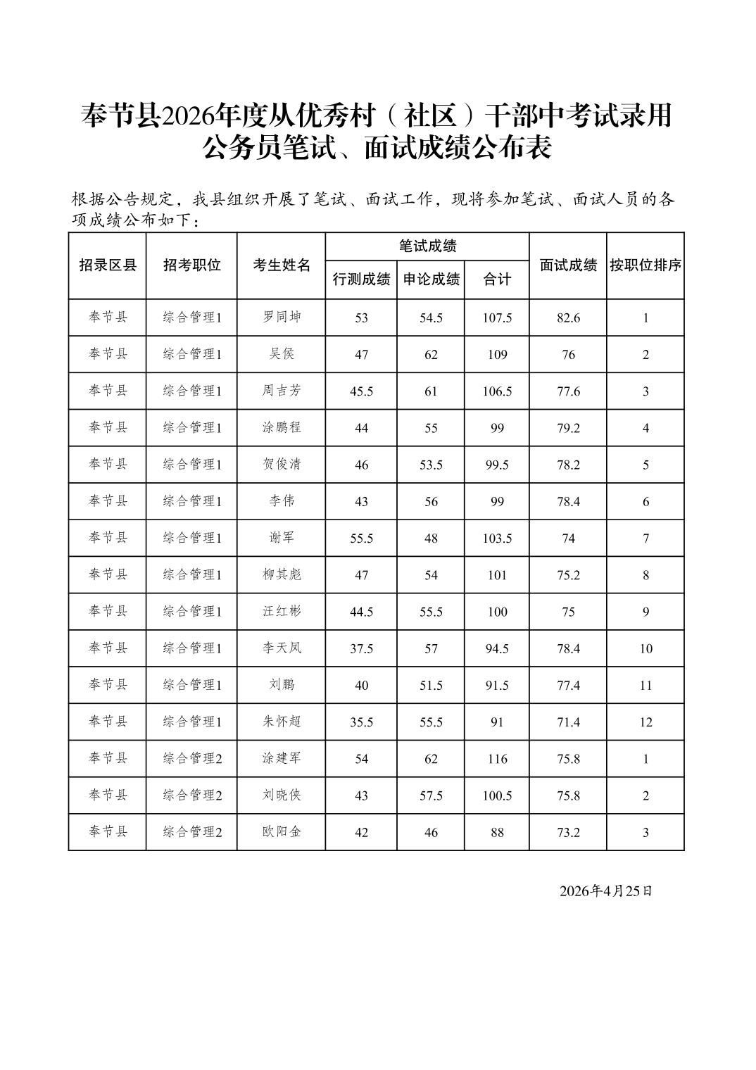 奉节县2026年度从优秀村(社区)干部中考试录用 公务员笔试、面试成绩公布表