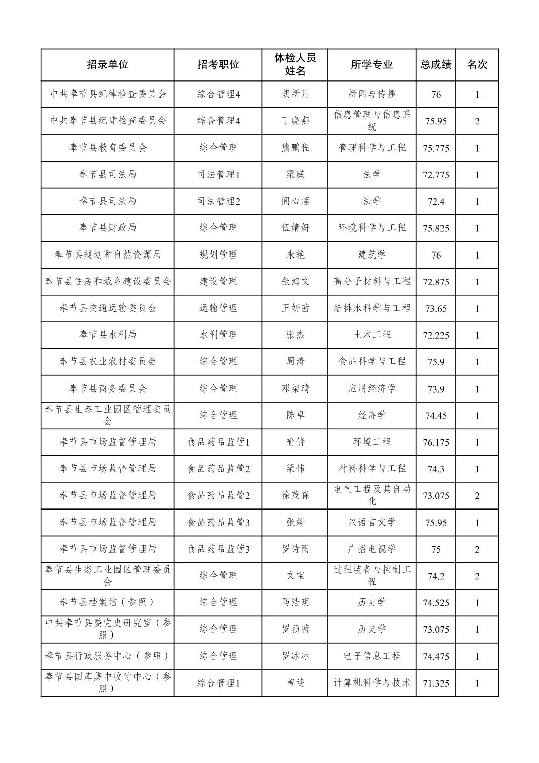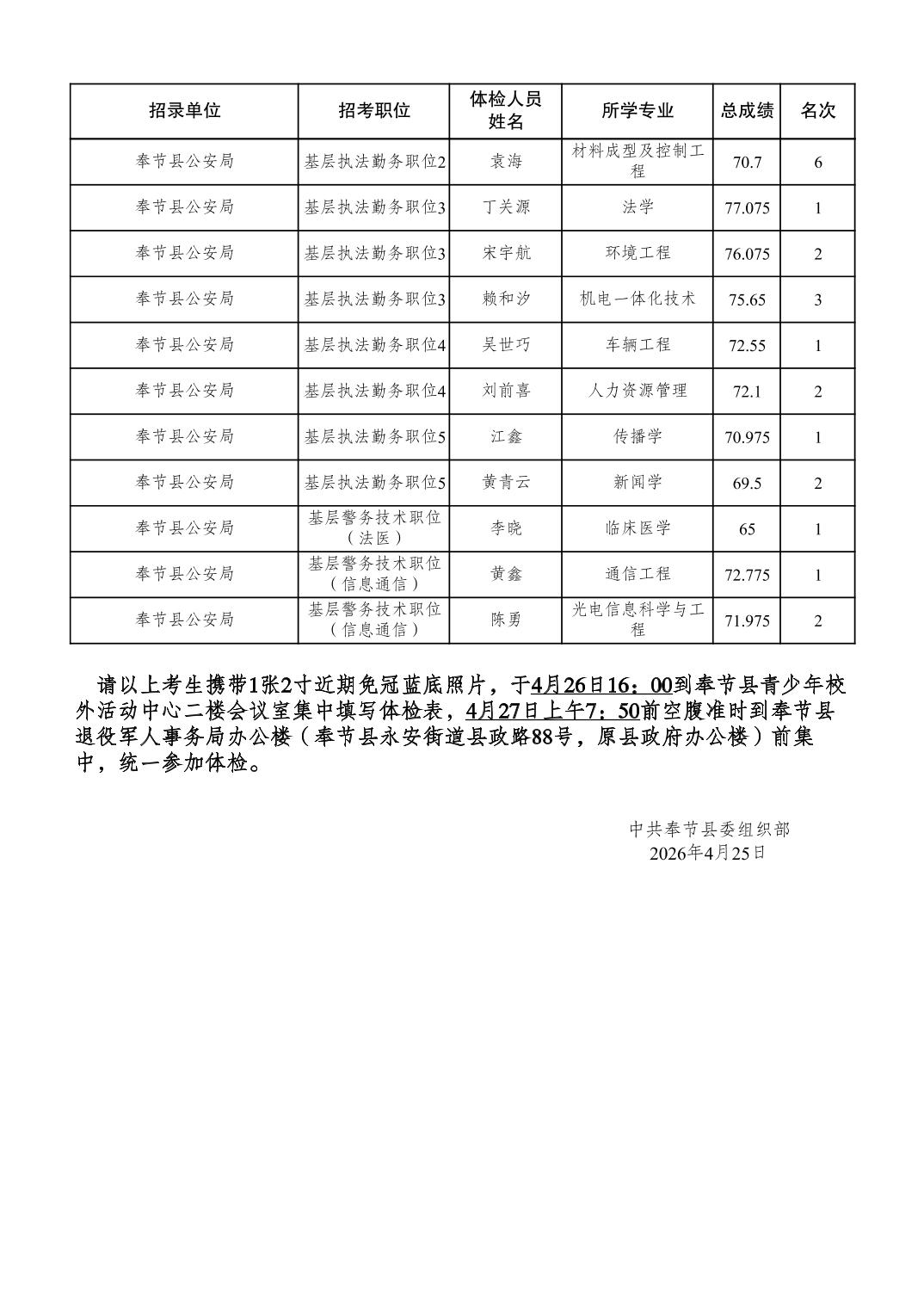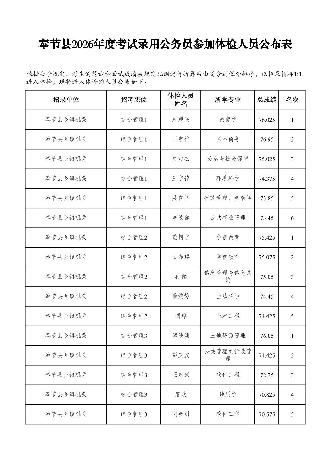 奉节县2026年度考试录用公务员参加体检人员公布表
