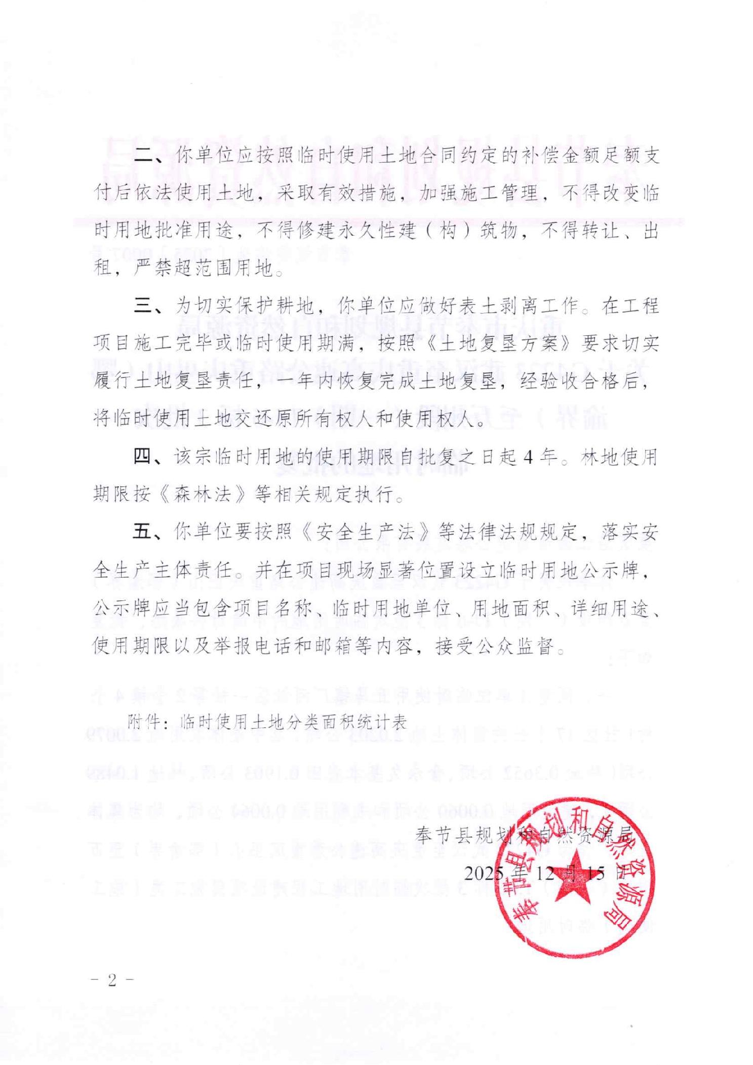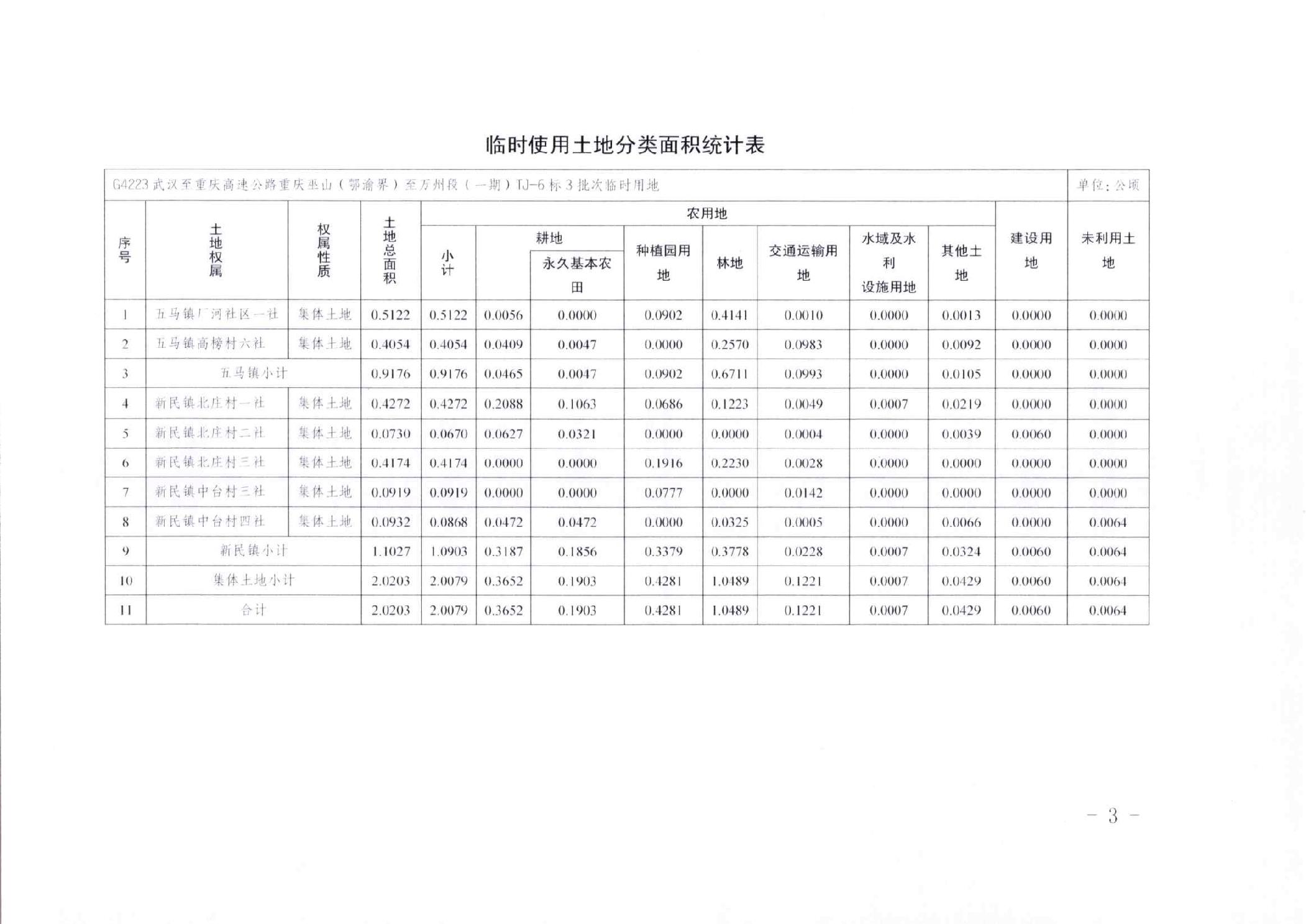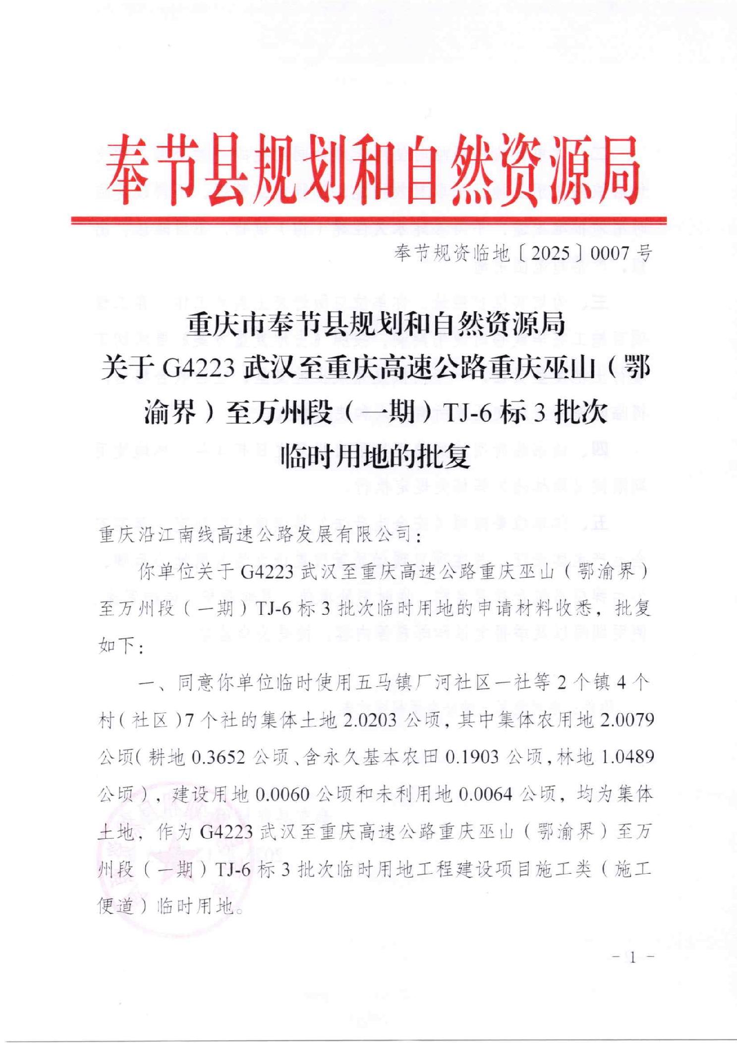重庆市奉节县规划和自然资源局关于G4223武汉至重庆高速公路重庆巫山(鄂渝界)至万州段(一期)TJ-6标3批次临时用地批复