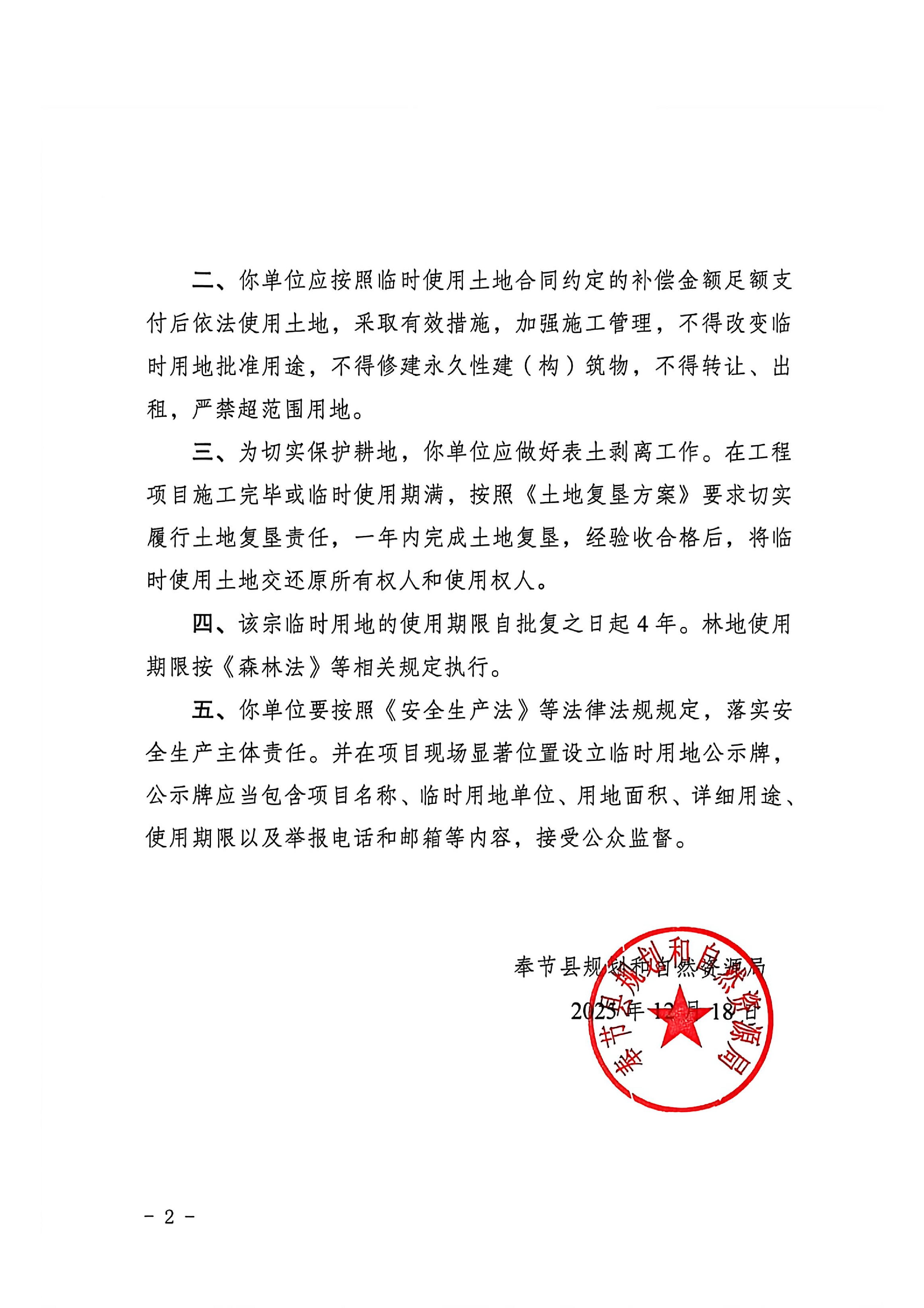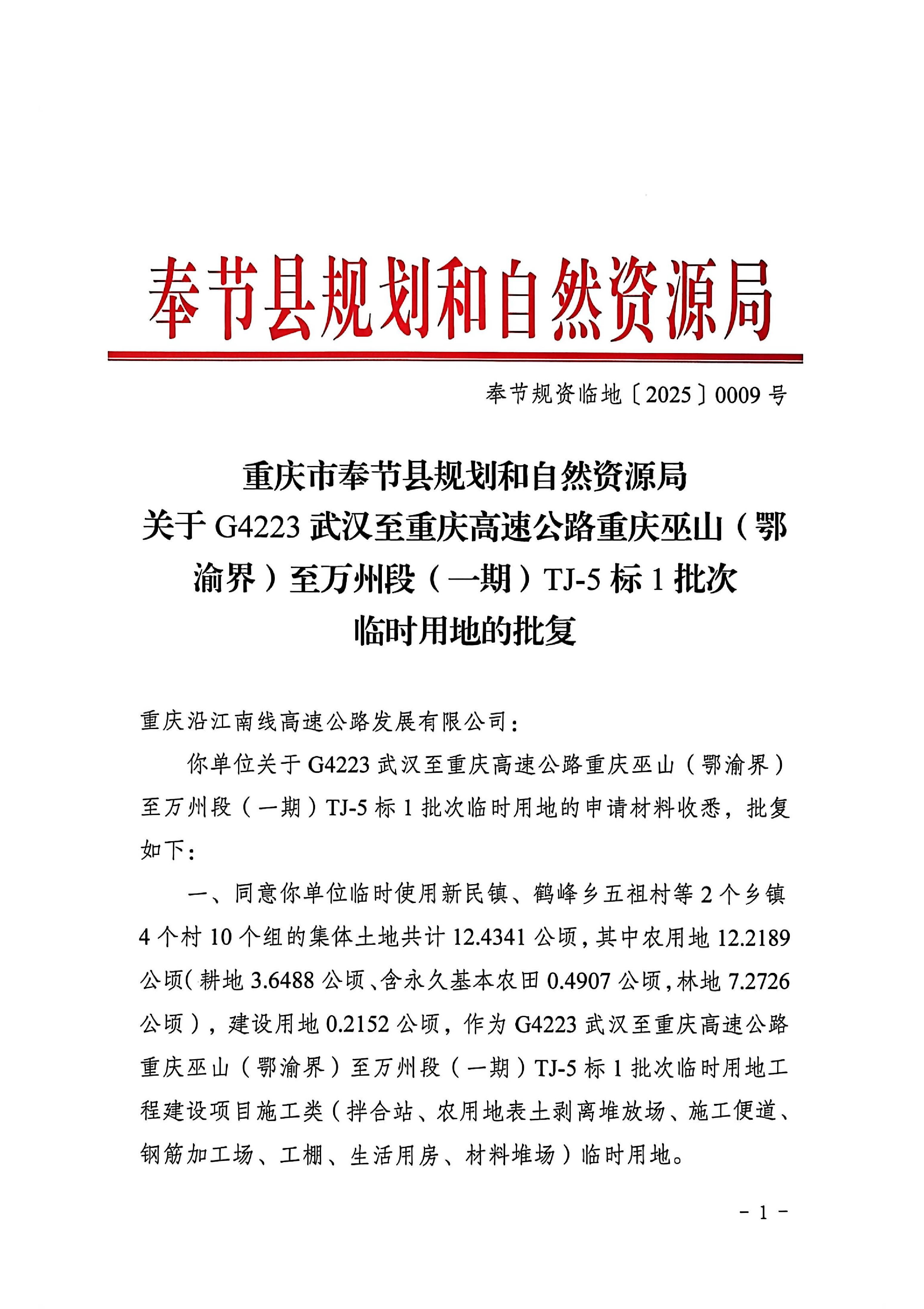 重庆市奉节县规划和自然资源局关于G4223武汉至重庆高速公路重庆巫山(鄂渝界)至万州段(一期)TJ-5标1批次临时用地批复