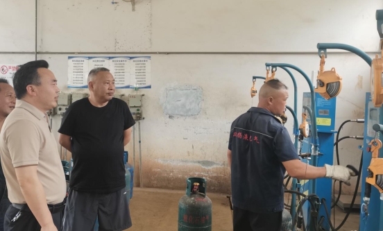 县经济信息委一行人员现场检查了气瓶储存、消防装置配备、安全巡查台账,以及液化气充装流程。同时听取了充装站负责人就日常安全巡查工作的汇报。