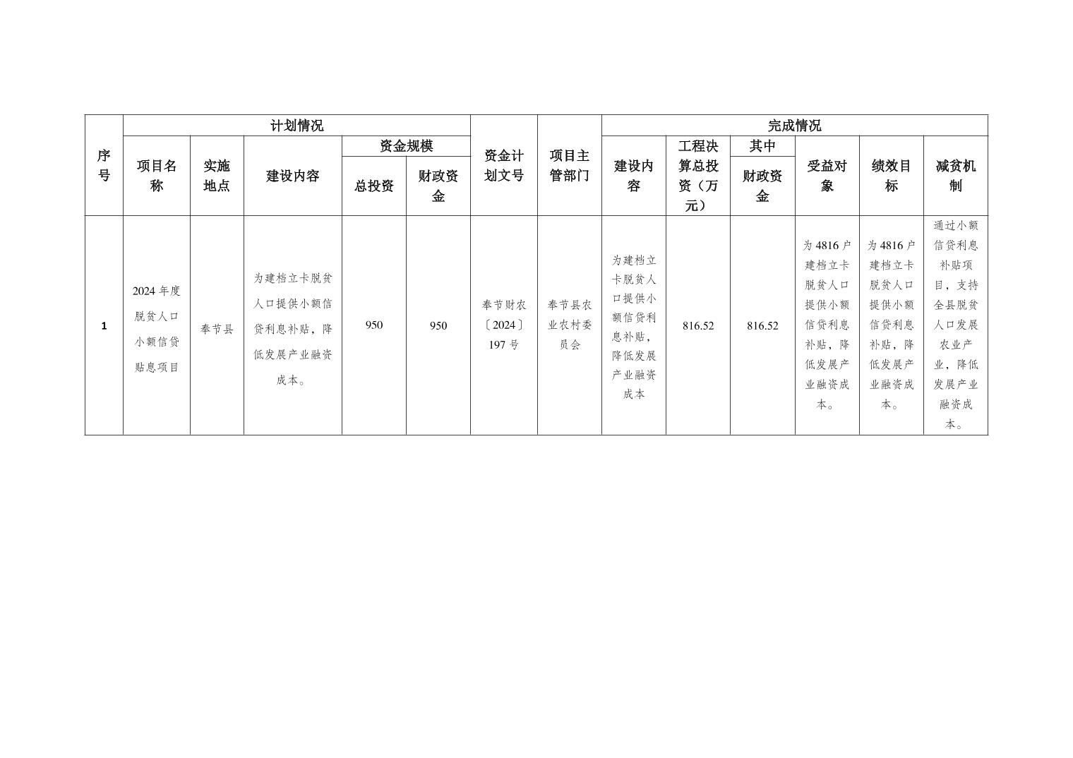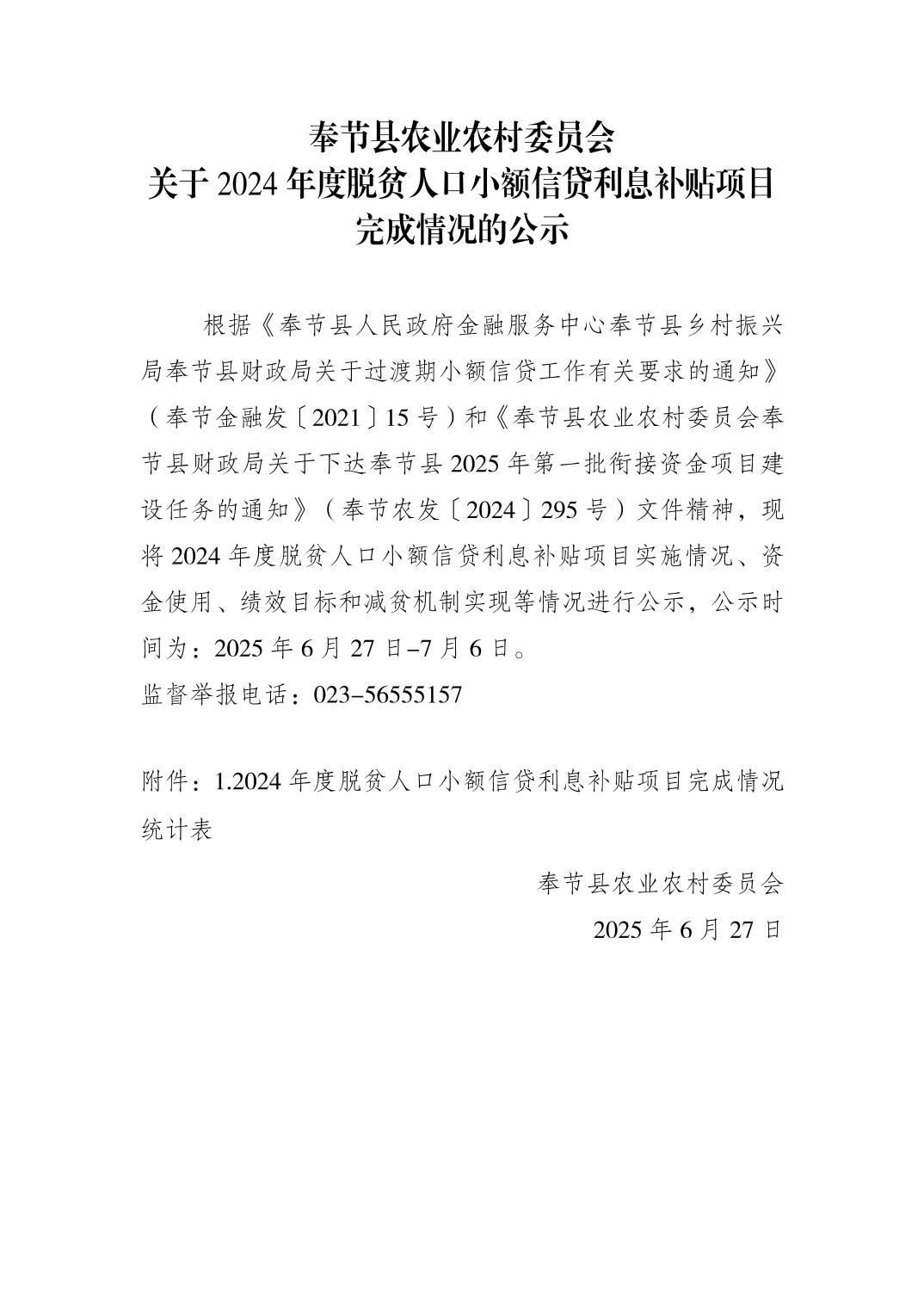奉节县农业农村委员会关于2024年度脱贫人口小额信贷利息补贴项目完成情况的公示