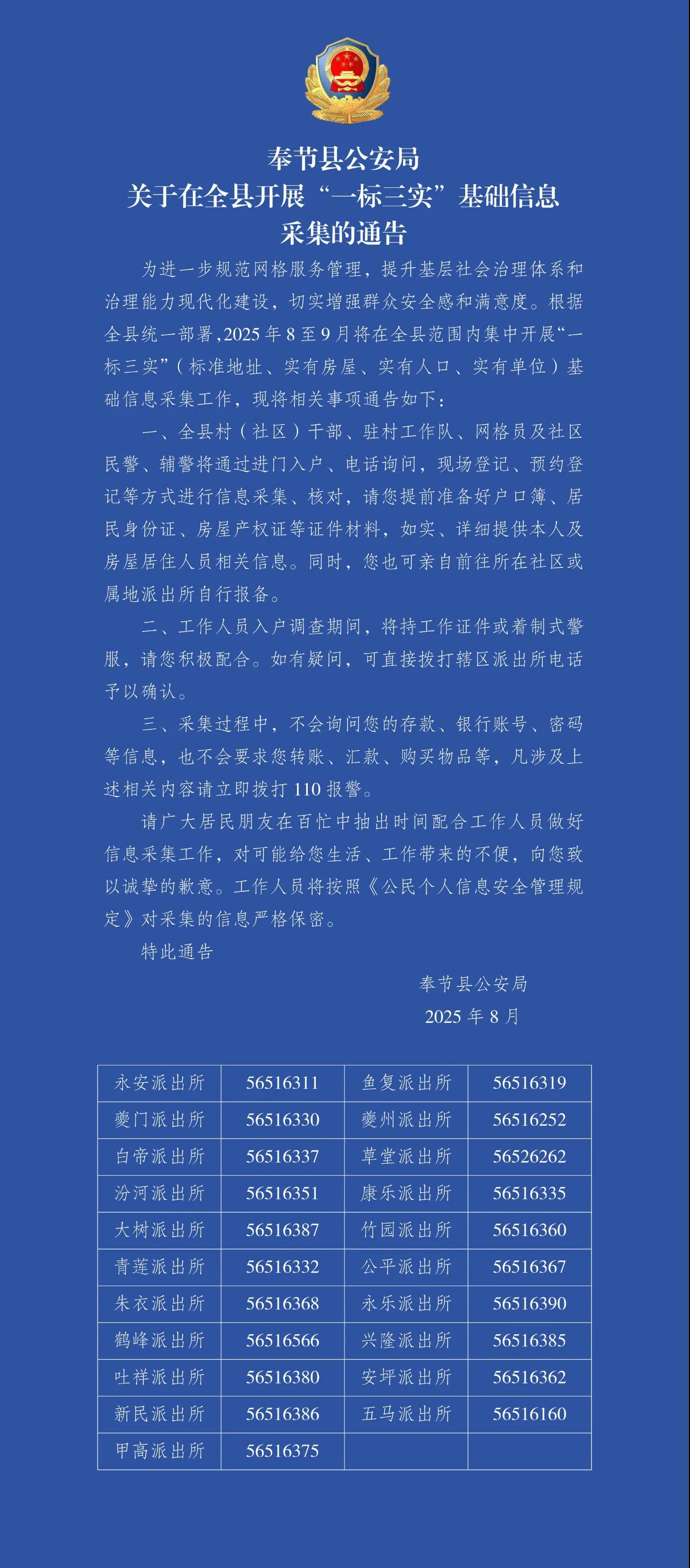 奉节县公安局关于在全县开展“一标三实”基础信息采集的通告