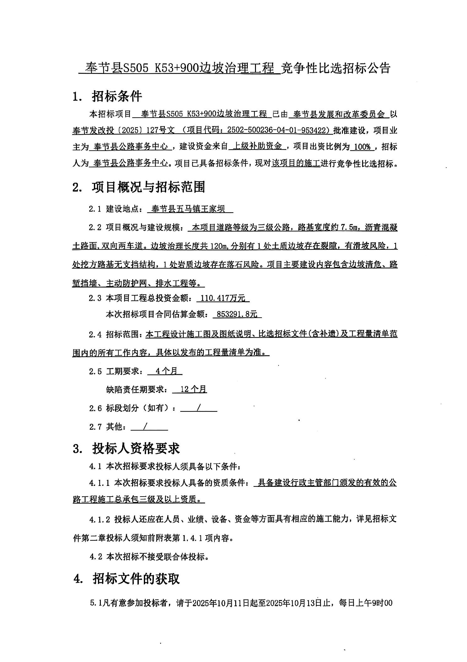 奉节县S505 K53+900边坡治理工程竞争性比选招标公告