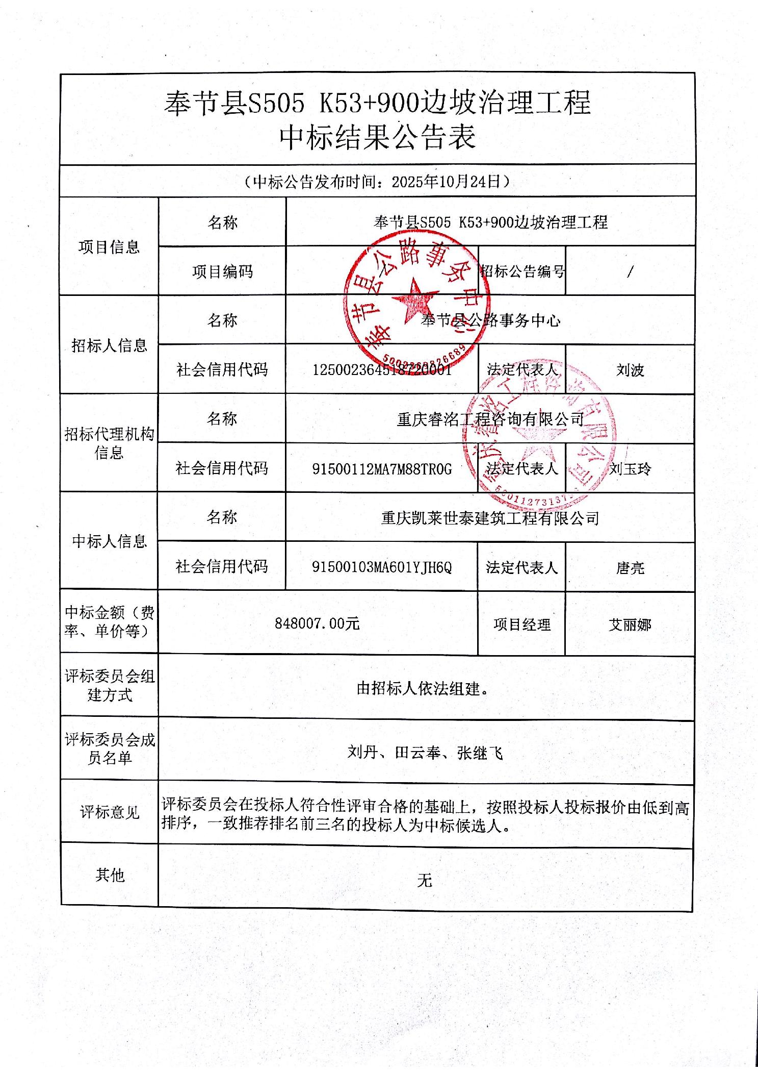 奉节县S505 K53+900边坡治理工程中标结果公示表