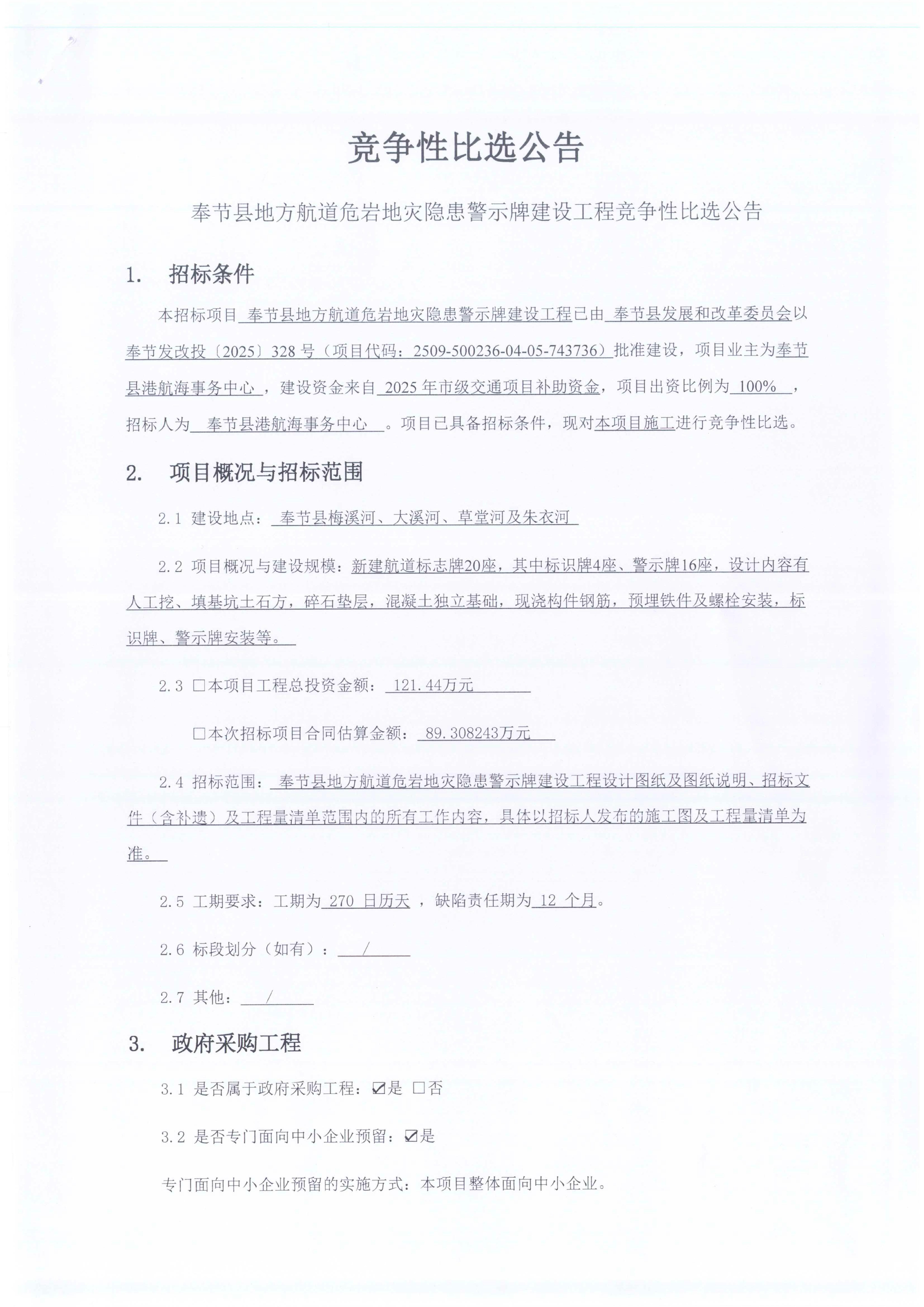 奉节县地方航道危岩地灾隐患警示牌建设工程竞争性比选公告