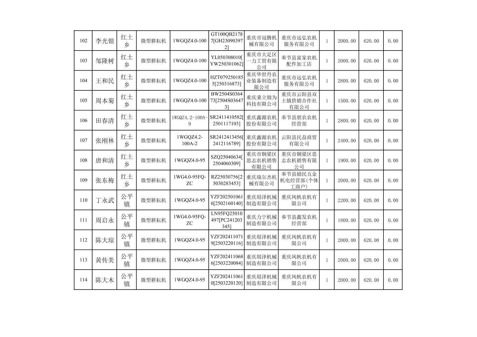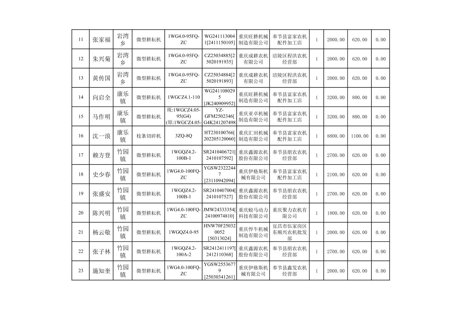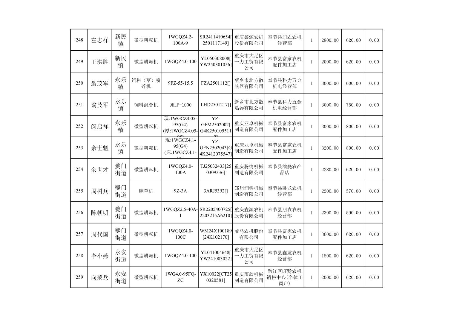 奉节县2025年农机购置补贴第10批次信息公示