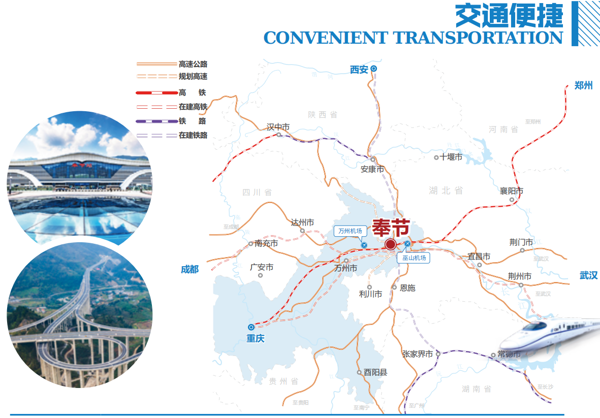 郑万高铁通车,奉节正式迈入“1.5小时到重庆,3小时到武汉、成都,4小时到郑州,6小时到北京”的高铁时代;沪蓉高速、安来高速在这里“十字”交汇,巫奉利高速、万巫南线高速加快推进;长江黄金水道穿境而过,拥有各类港口码头12座,泊位19个,水上运力规模居全市第四;毗邻巫山、万州两座机场,距巫山机场半小时车程、万州机场1小时车程。