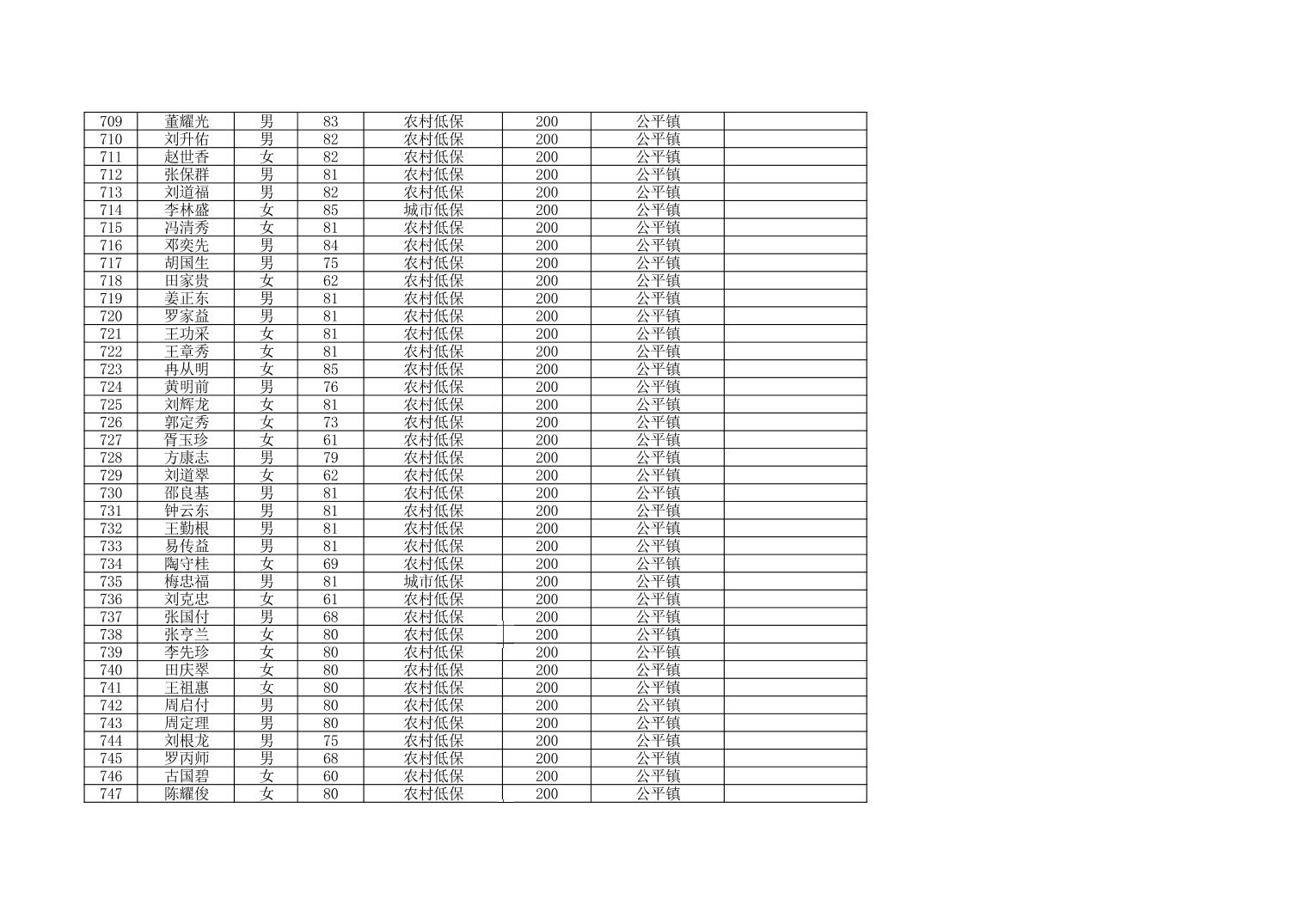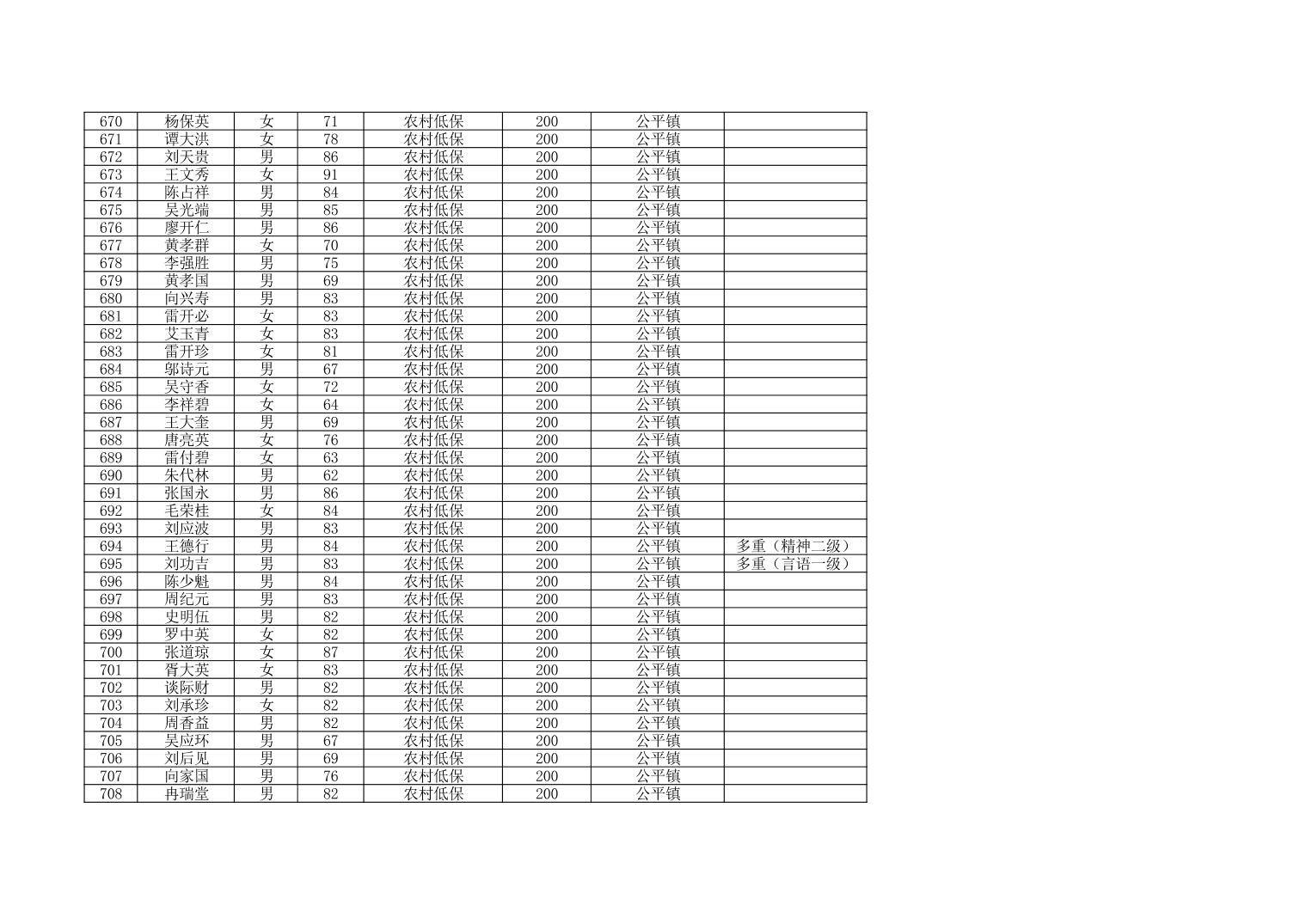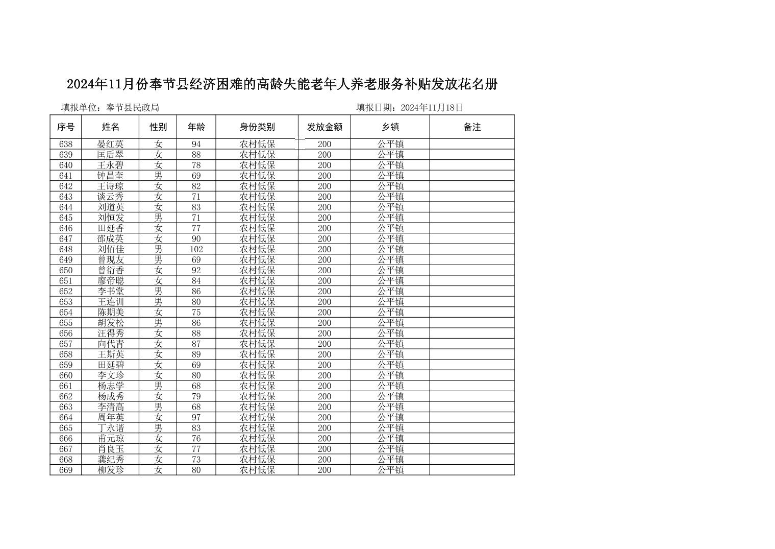 2024年11月公平镇经济困难的高龄失能老人养老服务补贴花名册