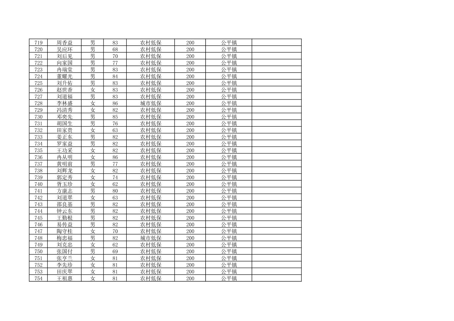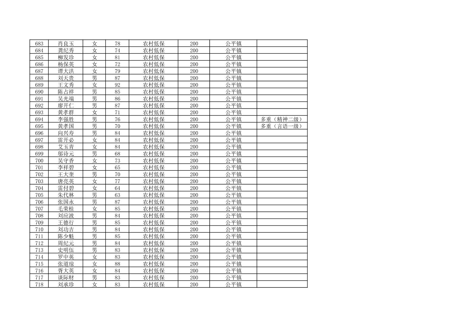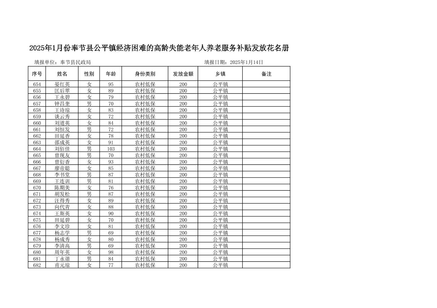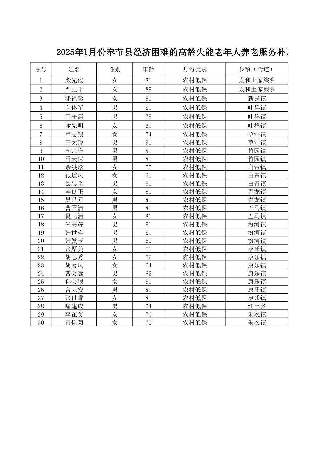 2025年1月份奉节县公平镇经济困难的高龄失能老年人养老服务补贴发放花名册