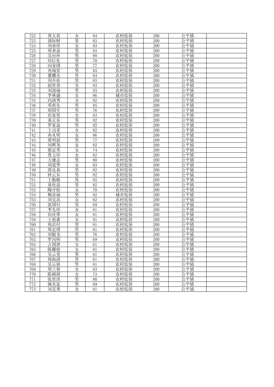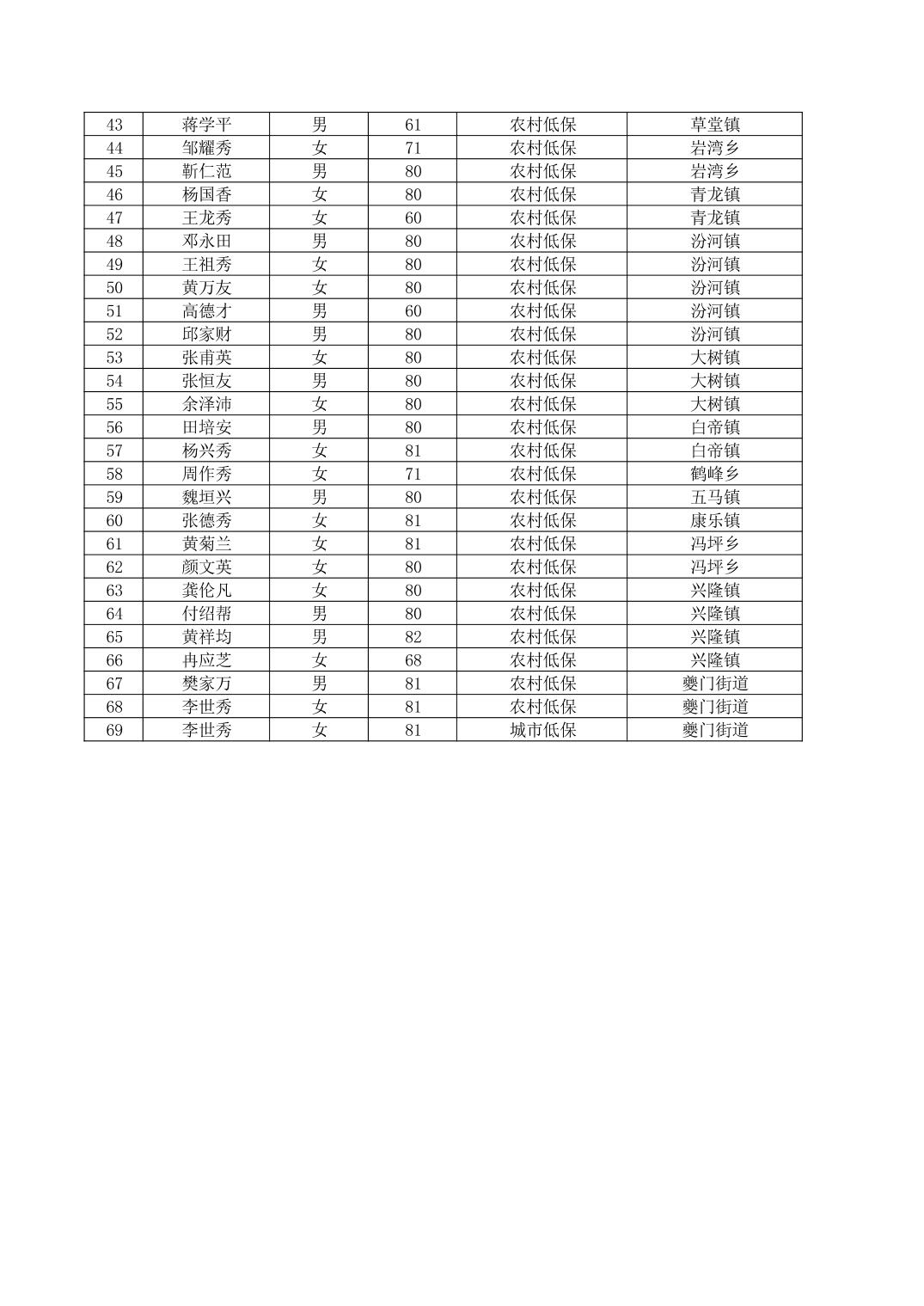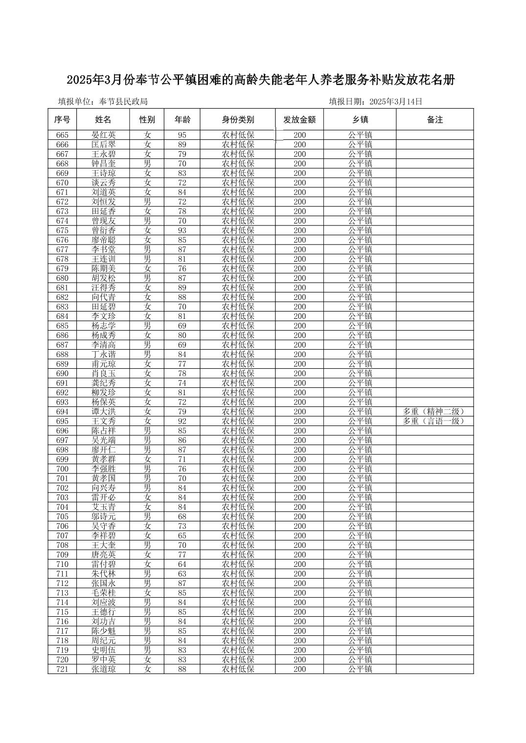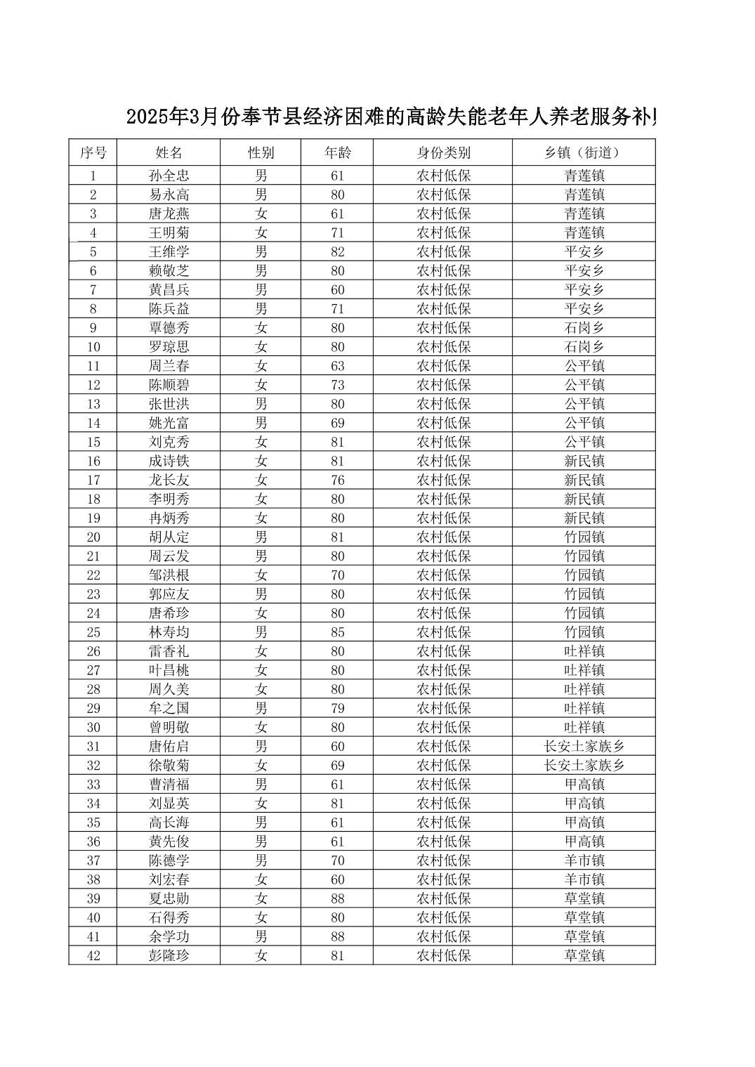 2025年3月份奉节公平镇困难的高龄失能老年人养老服务补贴发放花名册