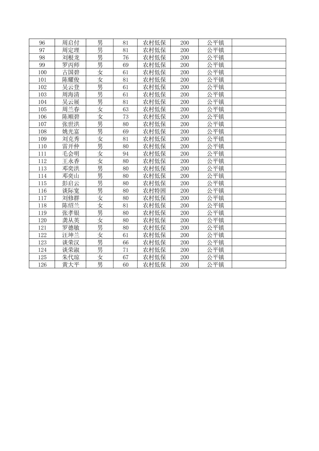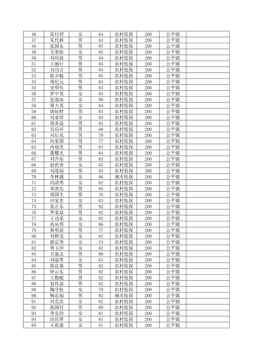 2025年7月份奉节县公平镇经济困难的高龄失能老年人养老服务补贴发放花名册