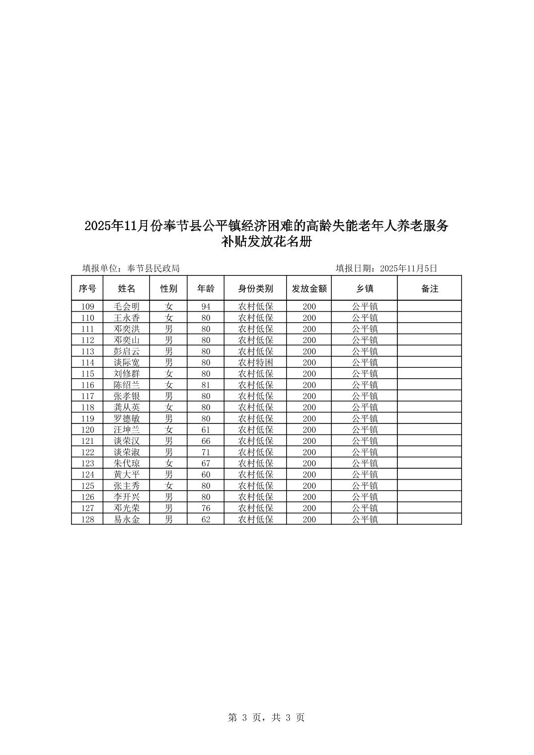 2025年11月份奉节县公平镇经济困难的高龄失能老年人养老服务补贴发放花名册