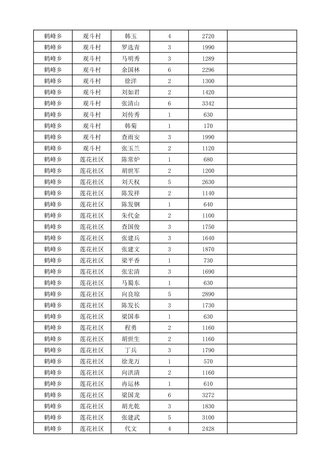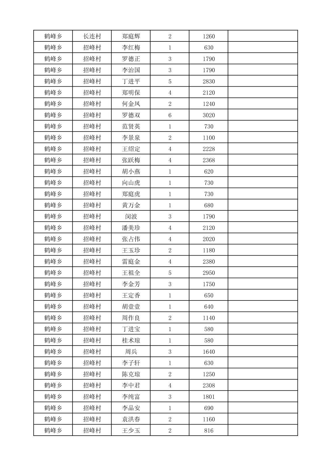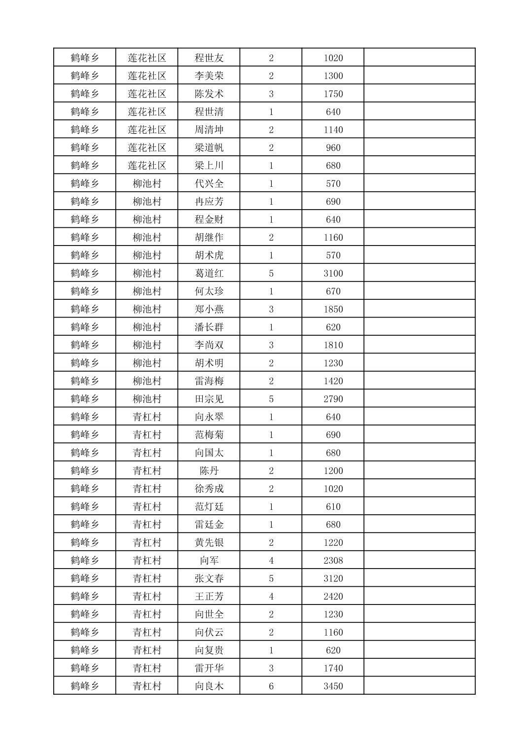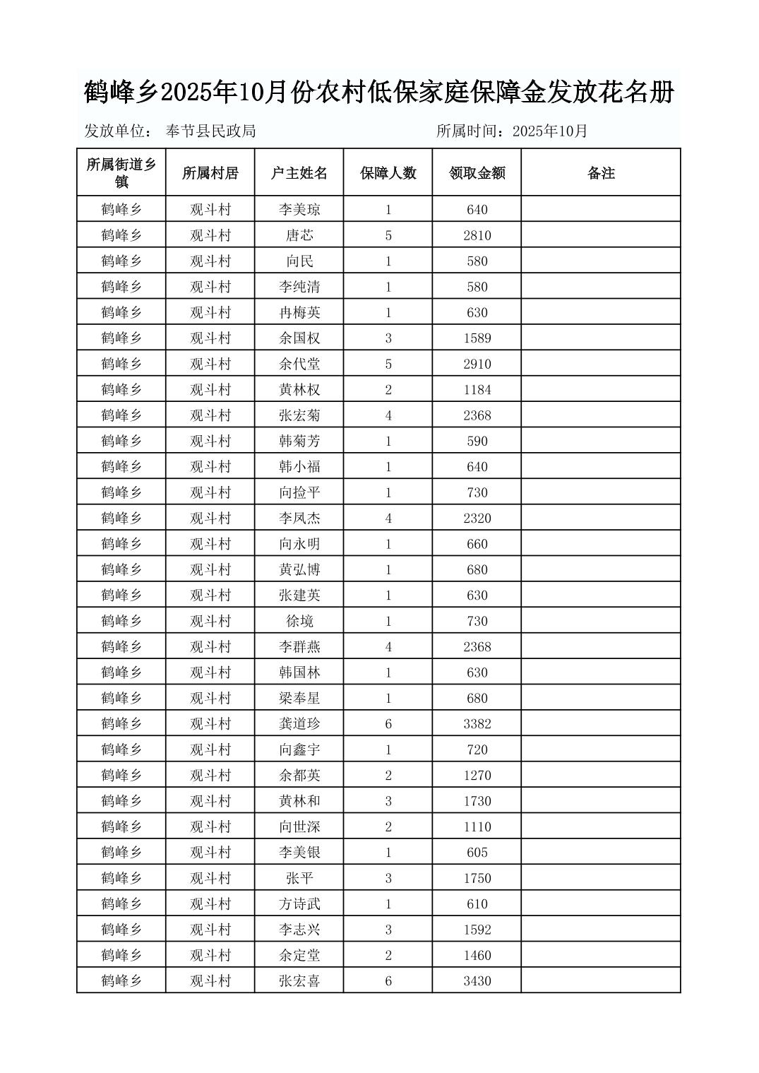 鹤峰乡2025年10月份农村低保家庭保障金发放花名册