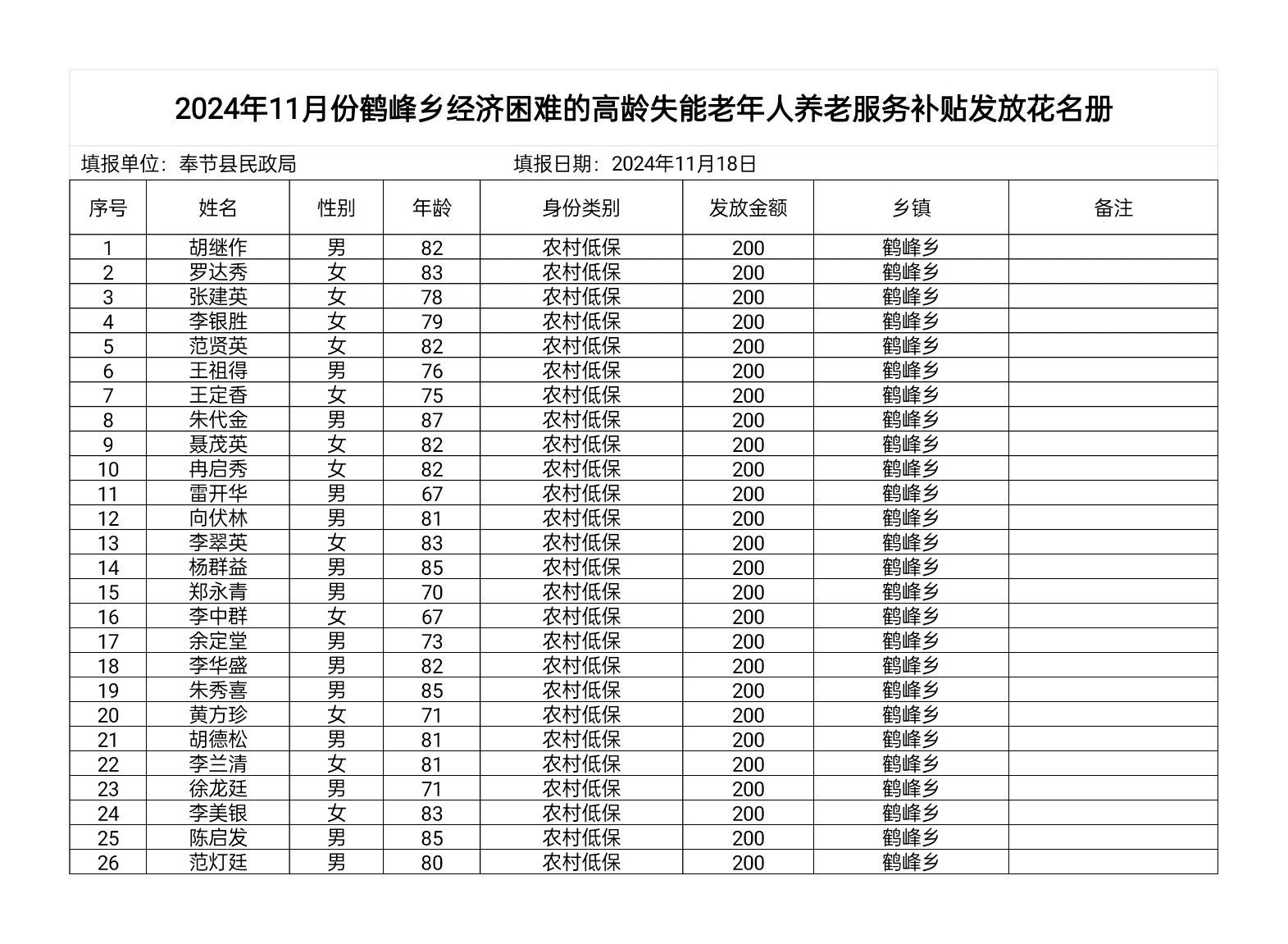 2024年11月份鹤峰乡经济困难的高龄失能老年人养老服务补贴发放花名册