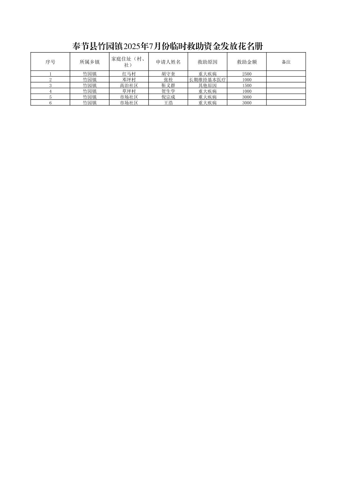 奉节县竹园镇2025年7月份临时救助资金发放花名册